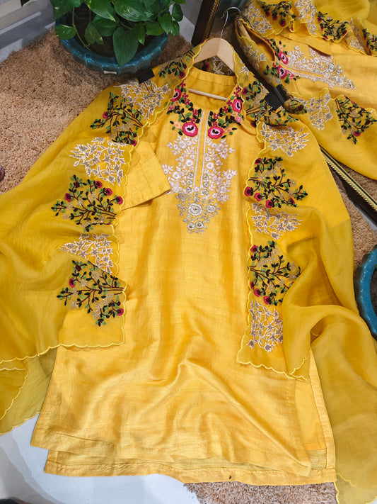 Enchanting Elegance: Pure chanderi Silk Pakistani kurta n pants Adorned with Exquisite Applique Embroidery MS009