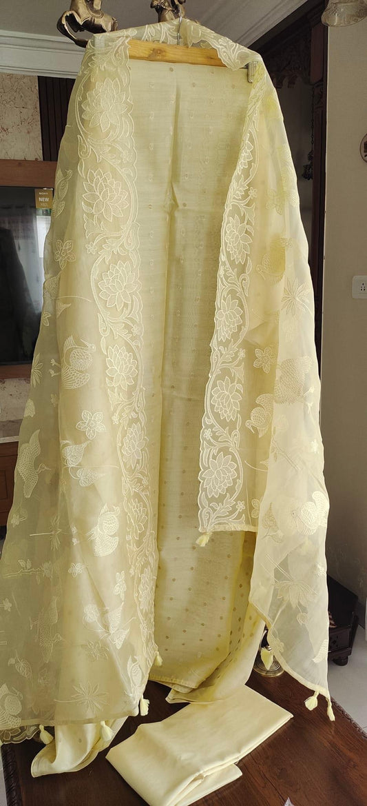 PURE CHANDERI Silk 70 Grams kurta /Pure Silk Organza Dupatta PARSI GARA UNSTITCHED SUIT CH54230