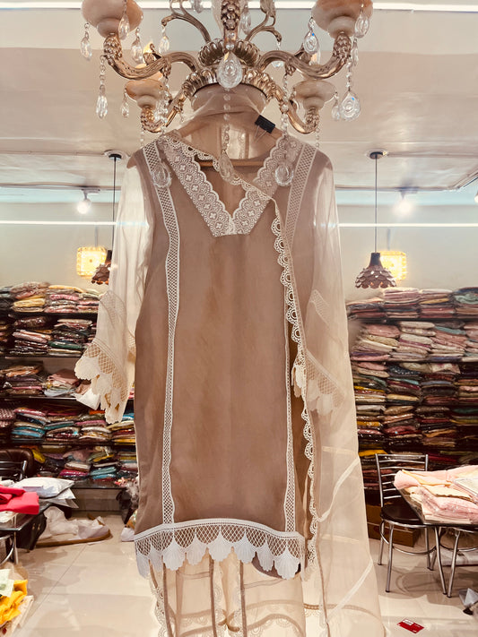 ATHARVA HERITAGE Beige Pure Silk Organza Pakistani Suit with Exquisite Lace Detailing SLP05053