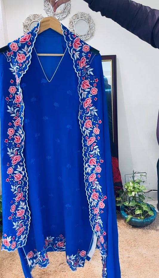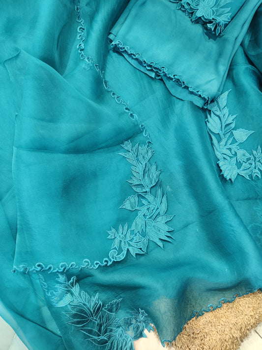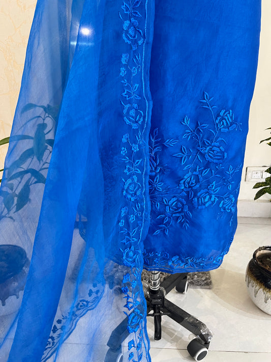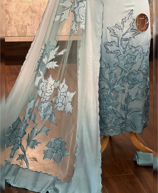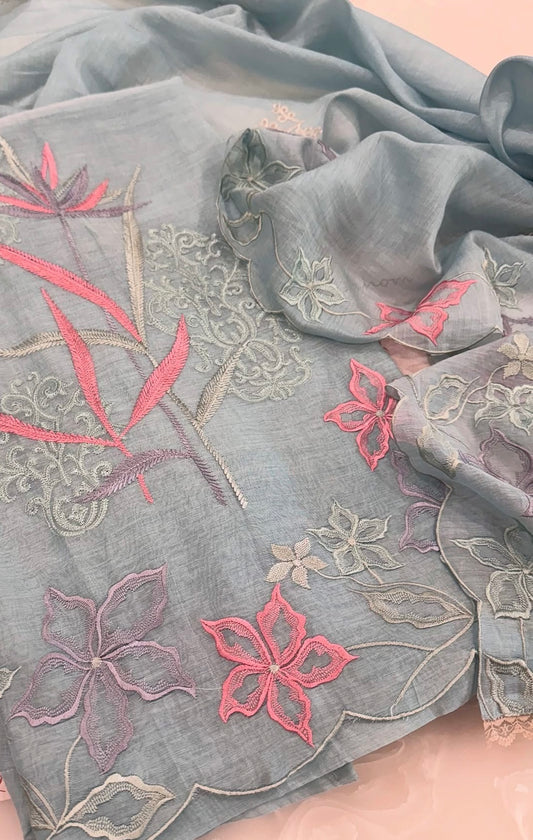 ATHARVA HERITAGE SHEER LUXURY PURE SILK ORGANZA PARSI APPLIQUE SUIT SHEER0030B Blue