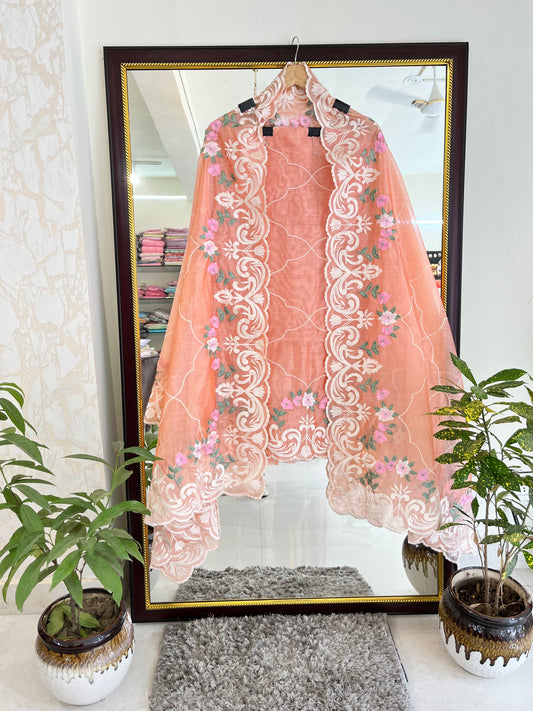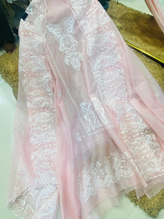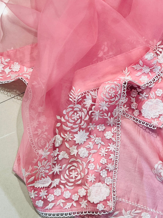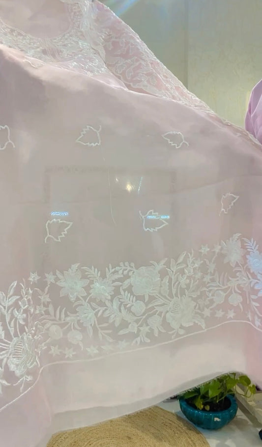 ATHARVA HERITAGE SHEER LUXURY PURE SILK ORGANZA PARSI APPLIQUE SUIT SHEER0030(F)Powder pink