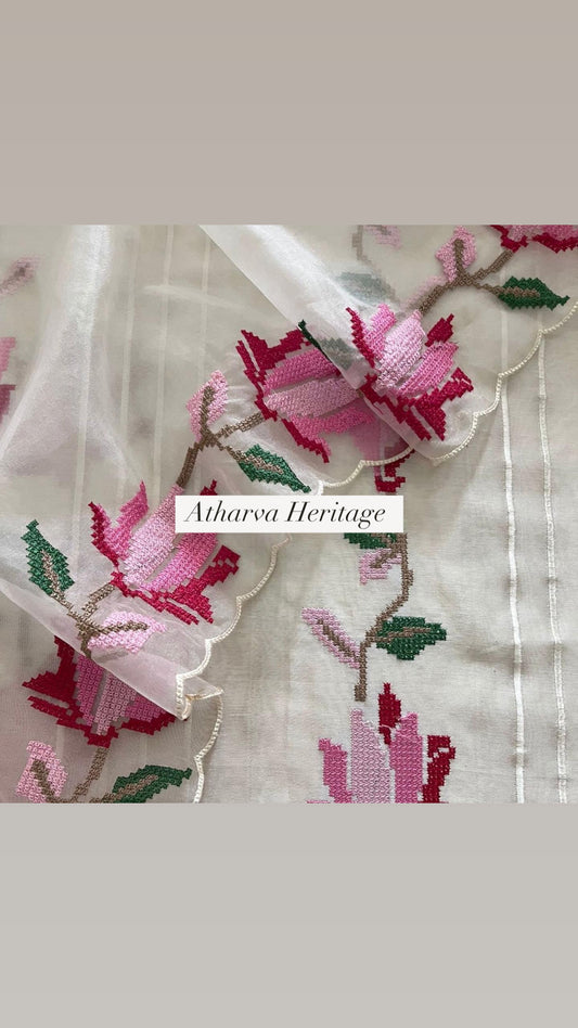ATHARVA HERITAGE PURE CHANDERI SILK AND ORGANZA KURTA DUPATTA / CROSS STITCH EMBROIDERY CHO0013