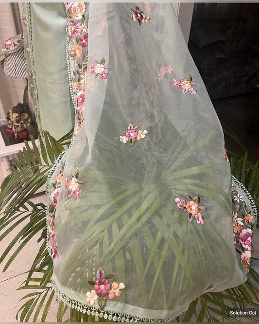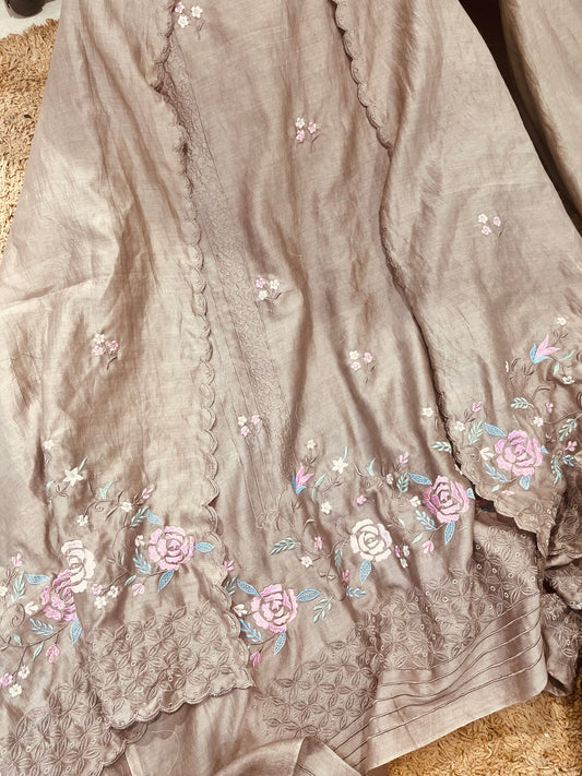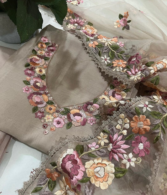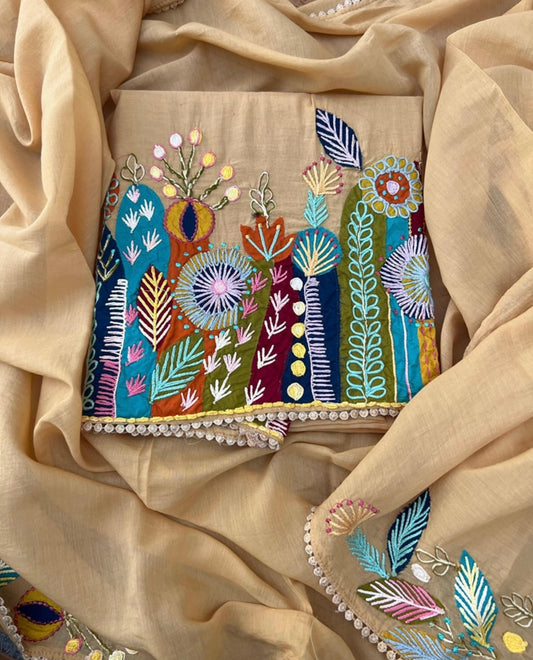 Pure Chanderi Silk 70 Grams kurta AND Dupatta Parsi Aari Embroidery Unstitched Suit CH54239