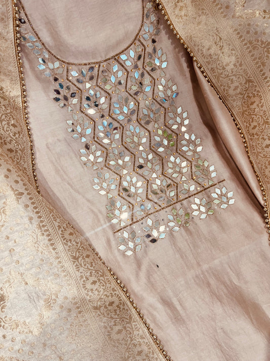 ATHARVA Hand Embroidered Salwar Kameez w/ Embroidered Neck Beige/Banarsi Silk Dupatta/Bridal/Wedding/Custom Stitch/ CH1295