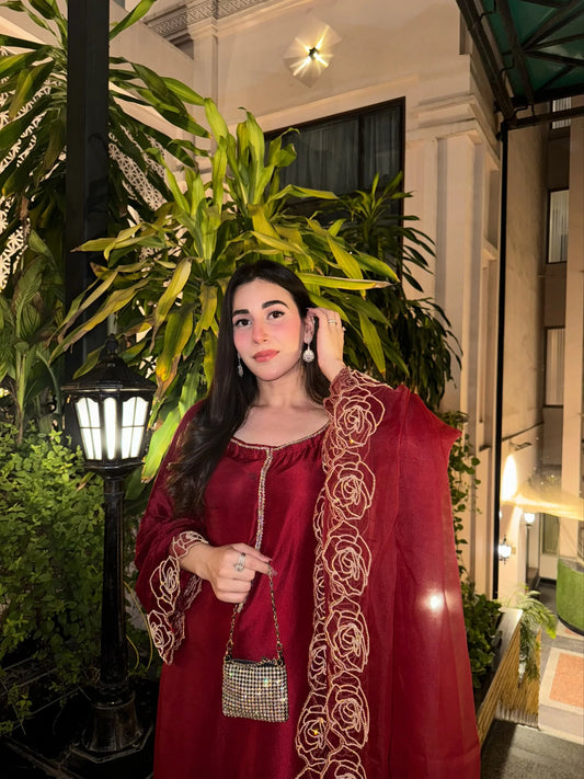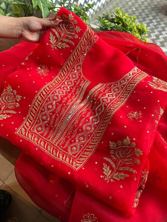 Atharva Heritage Red Noor Organza Silk Chikankari Unstitched Kurta Dupatta Set SL89000646