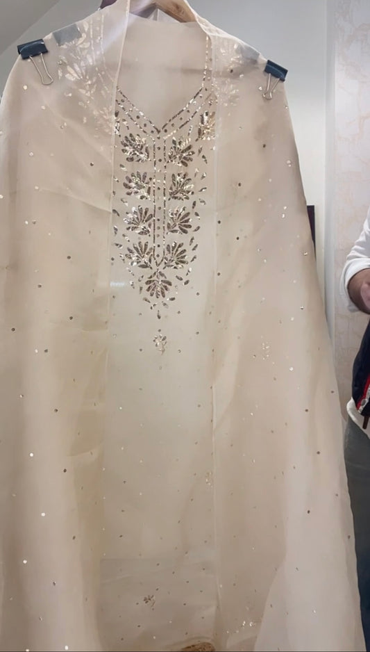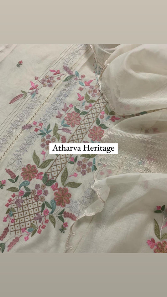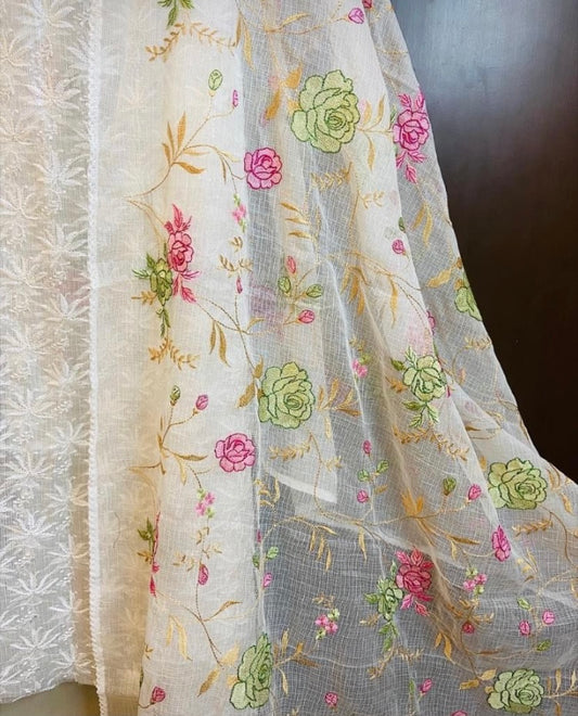 Atharva Embroidered Pure Cotton Kota Doria Salwar Kameez/Embroidery Kota Dupatta Ivory /Kota Embroidery Shirt Ivory/Cotton Bottom- KK0021