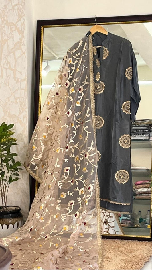 "Enchanting Elegance: Pure Silk 80 Grams Suits Adorned with Exquisite Pita Embroidery and Stunning Pure Silk Organza Gota Embroider SS0021 charcoal Grey