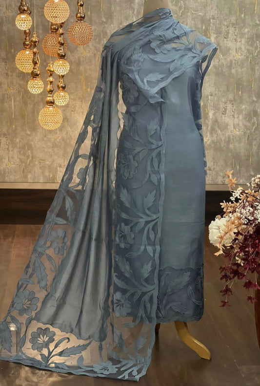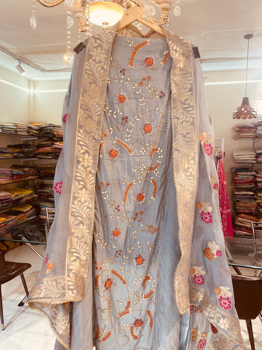 ATHARVA Cut-Work Embroidery Salwar Kameez/Grayish Blue & Brown Chanderi/Custom Stitch Unstitch/Anarkali/Plazzo/Churridar/Gift/Colors/CUT8037