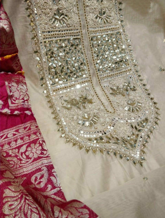 ATHARVA Applique Embroidery Salwar Kameez/Chanderi Cut-Work Shirt & Dupatta/Santoon Bottom/Custom Stitch Unstitch/Plazo/Pant/CUT8128(A)