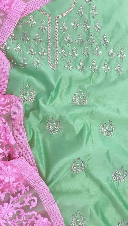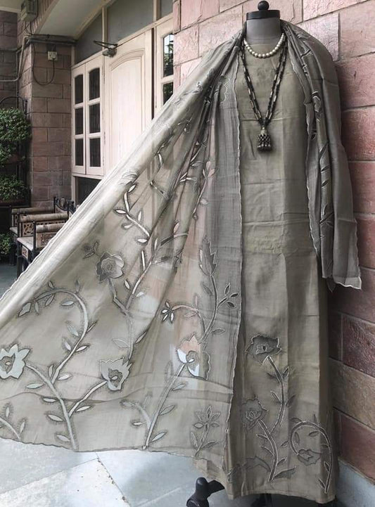 ATHARVA Applique Embroidery Salwar Kameez/Chanderi Cut-Work Shirt & Dupatta/Santoon Bottom/Custom Stitch Unstitch/Plazo/Pant/CUT8119(C)