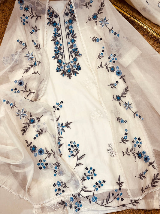 Atharva Heritage/Pure Mul Chanderi Shirt & Dupatta/ Hand Applique/Cutwork with Thread Embroidery/Cotton Silk Bottom/CUT80391