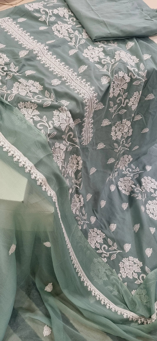 Atharva Heritage Pure Mul Chanderi Kurta/Pure Chiffon Dupatta / French Thread Embroidered SUIT CHO00161 Pista
