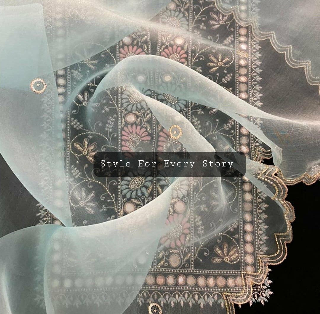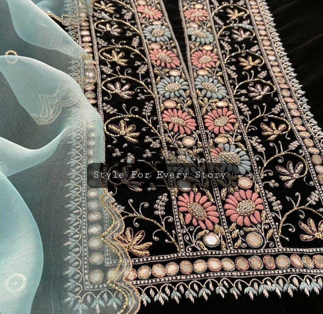 Complementing this masterpiece is a pure silk organza dupatta, finished with four-sided scalloping and scattered mirror embroidery, paired with pure silk velvet bottoms for a cohesive, opulent look. Unstitched and versatile, the ensemble can be custom-fitted to your unique measurements, making it a statement of bespoke luxury and enduring heritage — exclusively from Atharv Heritage.