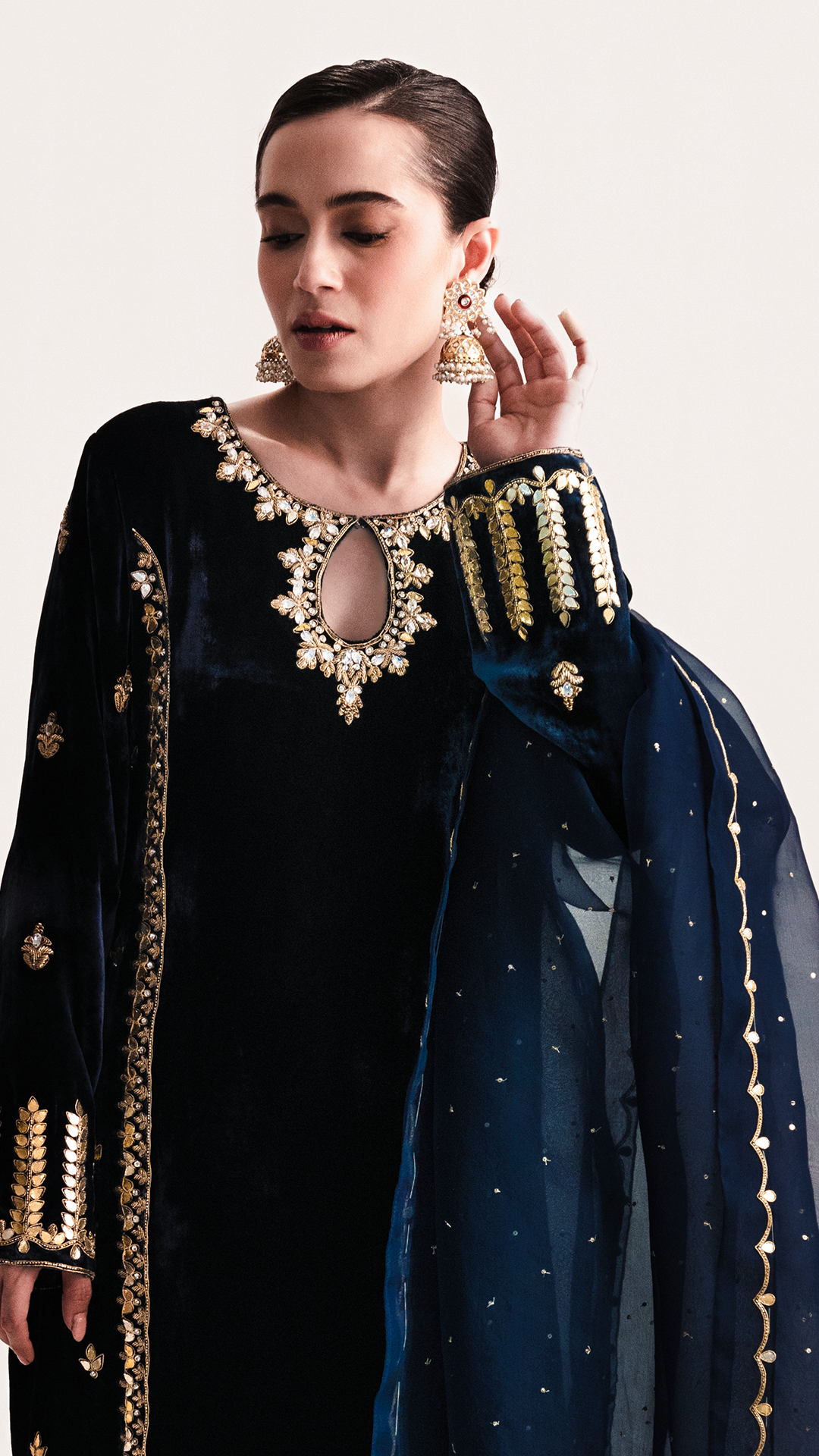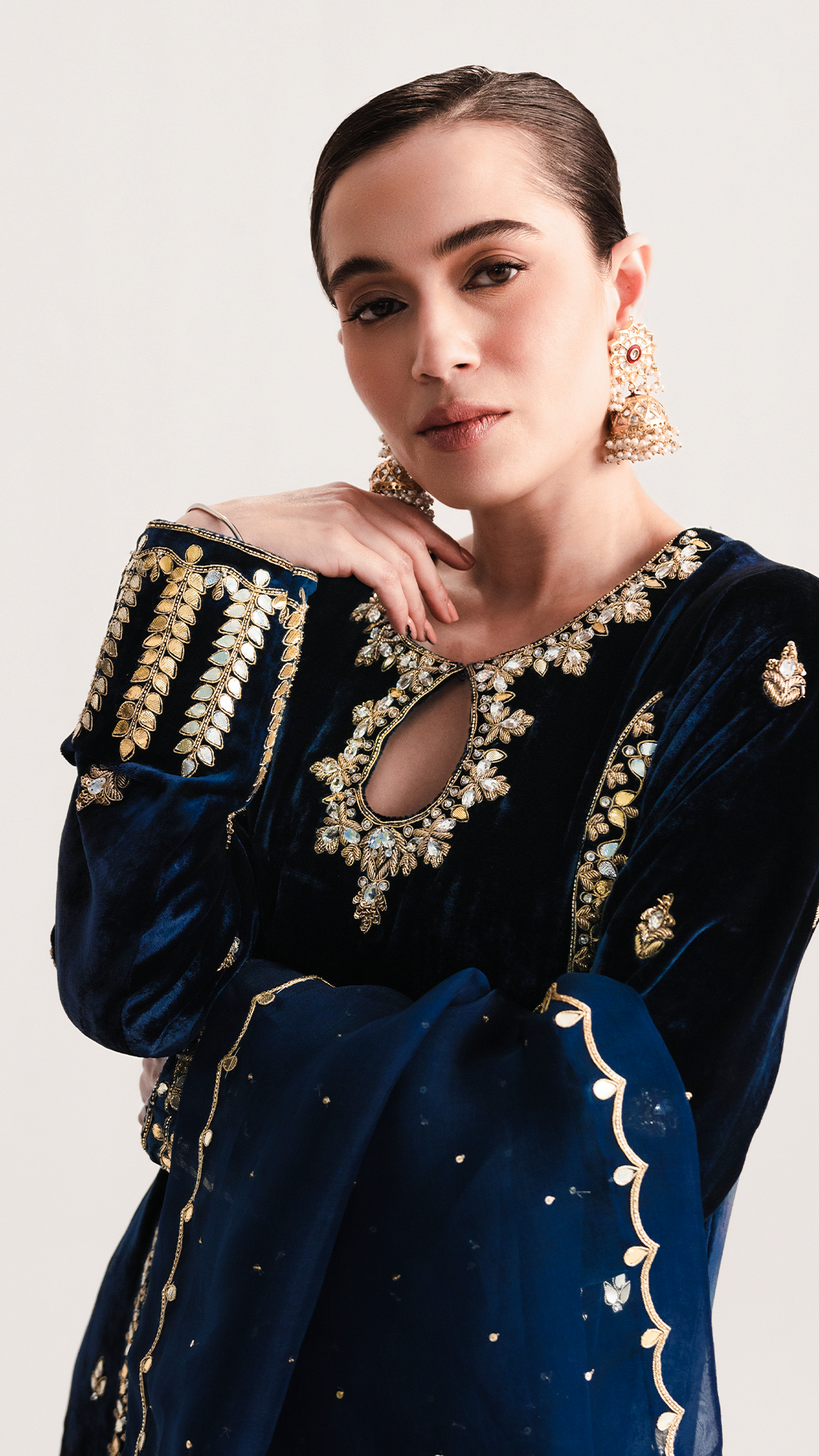 Gorgeous Pure Silk Velvet kurta Having Elegant Hand Embroidered Work on Neckline Sleeves and back , Along With Pure Silk Crush bottom