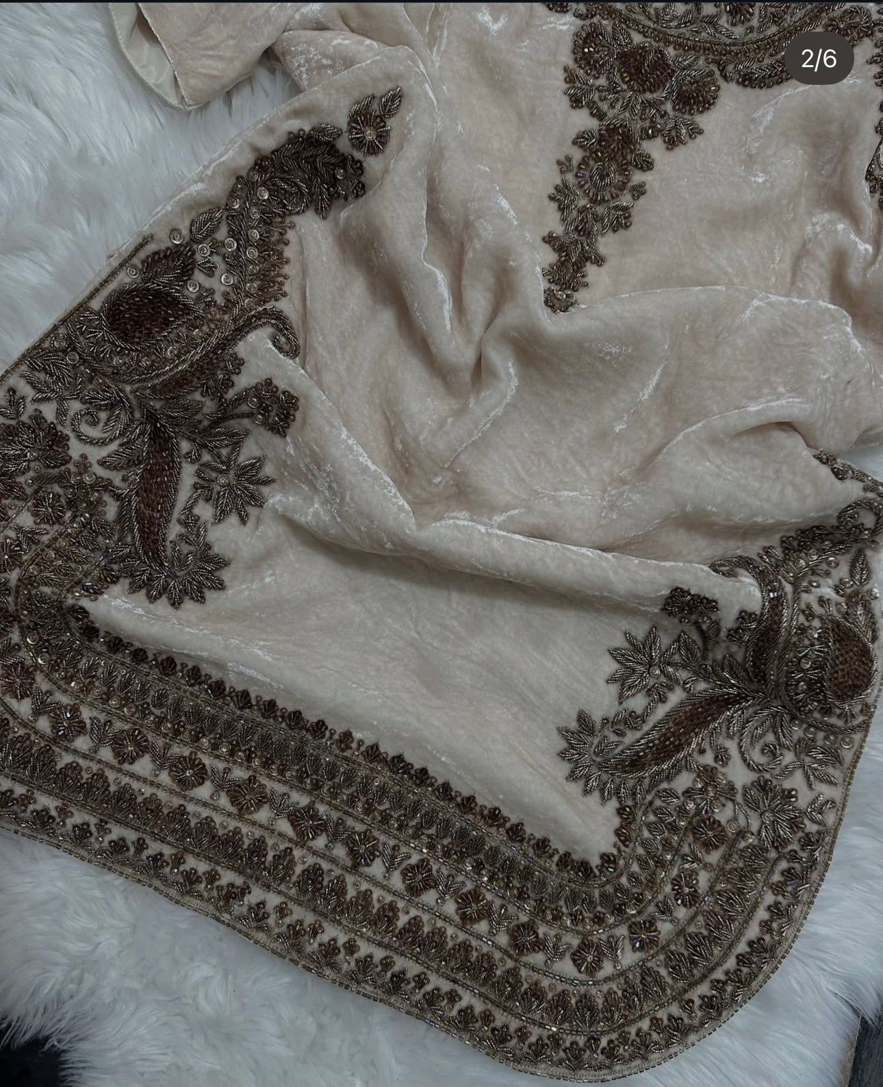 Step into timeless luxury with our 100% pure silk velvet top, crafted in an ethereal shade of pristine white—a universally loved color that radiates elegance. This couture masterpiece is adorned with Hand Antique Zardozi embroidery, meticulously crafted by master artisans using traditional, centuries-old techniques.