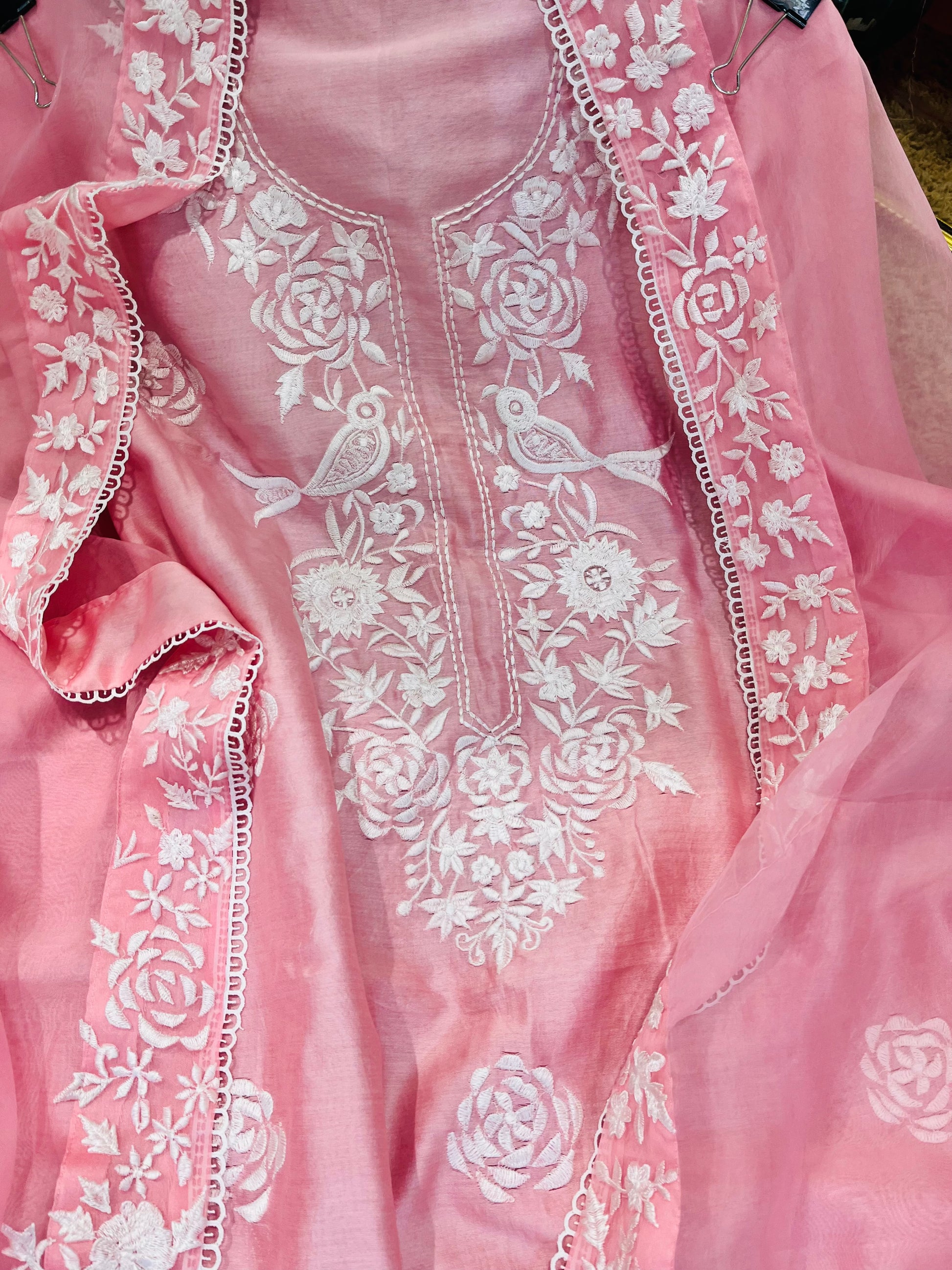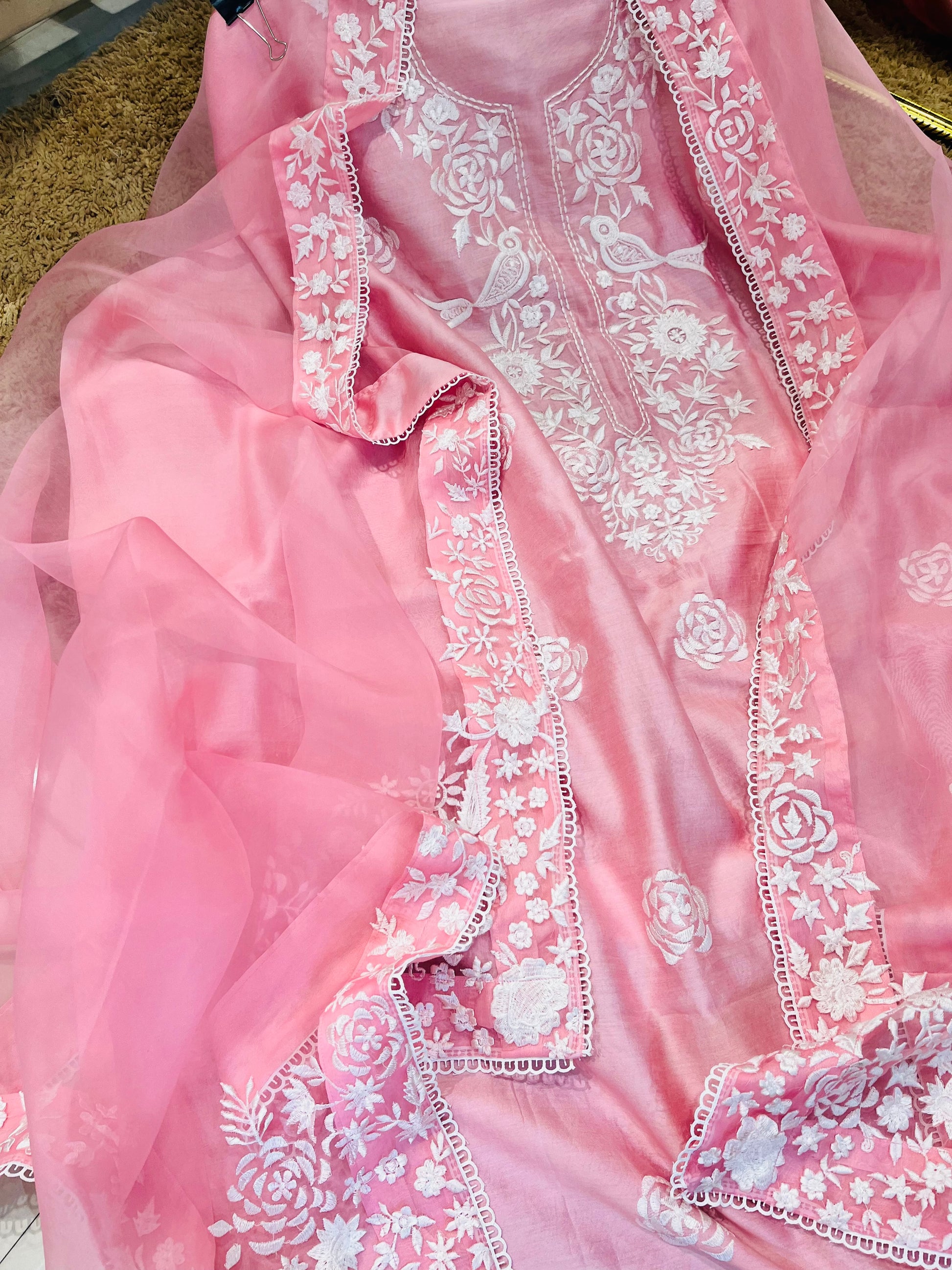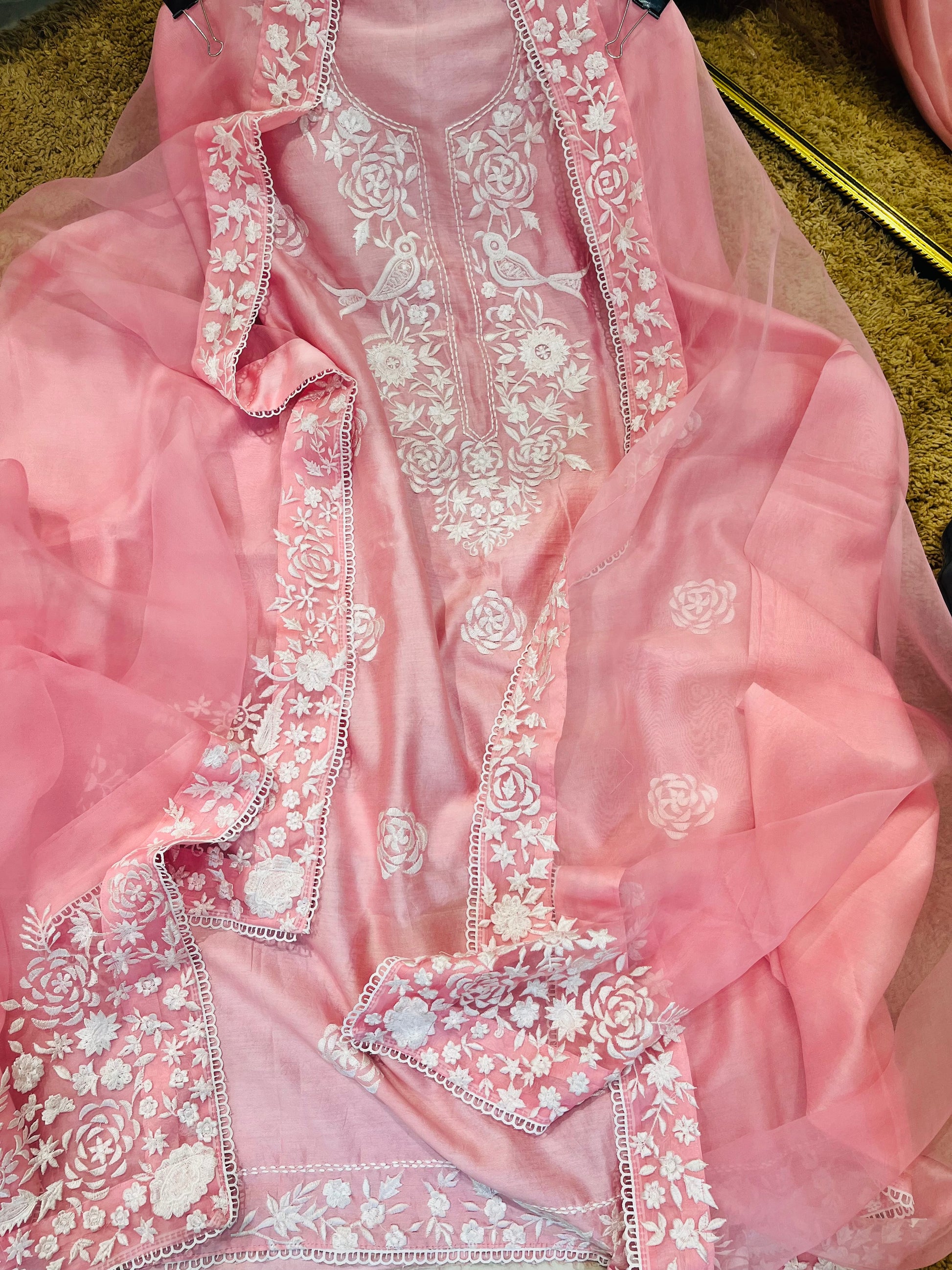 Step into a world of timeless elegance with this Pure Chanderi Silk Kurta, adorned with intricate Parsi embroidery on the yolk, delicate bootis, and graceful ghera. The sleeves and pants are enhanced with exquisitely embroidered Parsi borders, adding depth and richness to every detail. Paired with a Pure Silk Organza Dupatta featuring a four-side embroidered border and enchanting floral corners, this ensemble is the epitome of luxury and artistry. Perfect for weddings, festive occasions, or any grand celebration, it is a true masterpiece that radiates sophistication and charm.