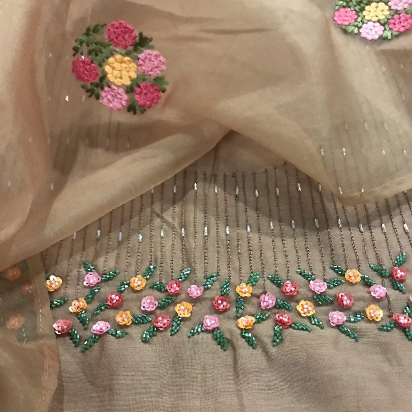 - Dupatta: Pure silk organza, beautifully embellished with scattered hand-embroidered floral motifs and fine threadwork.