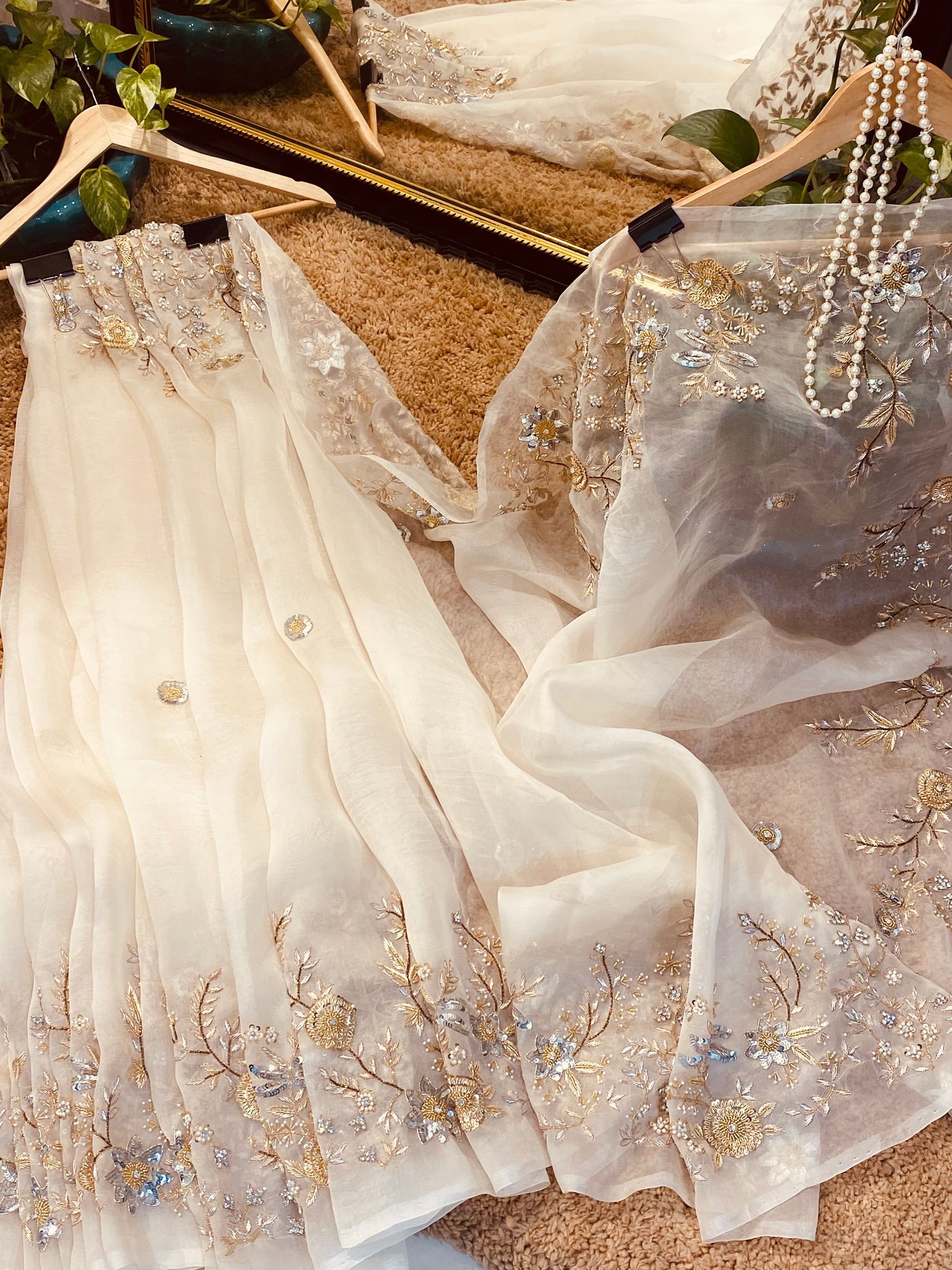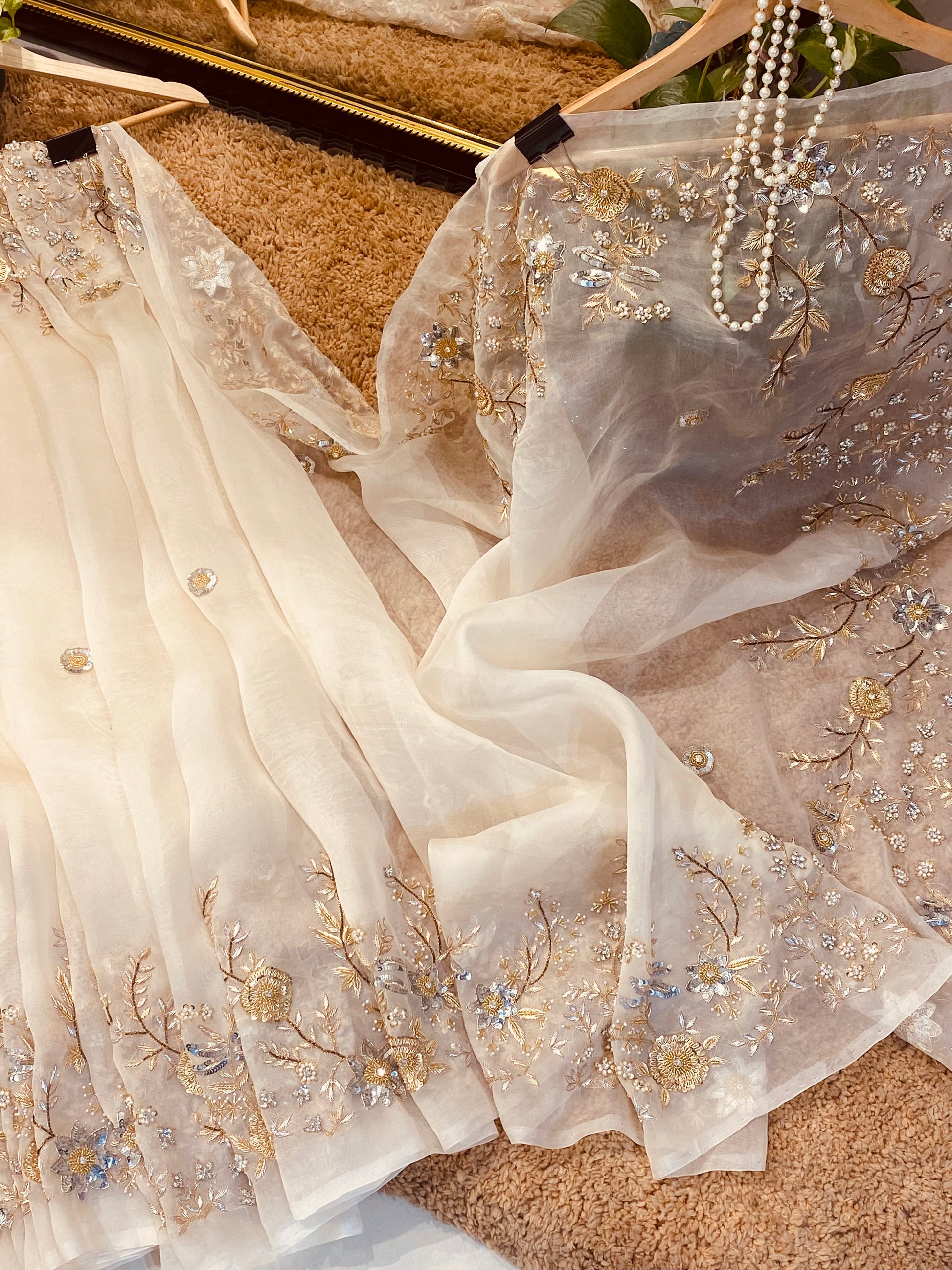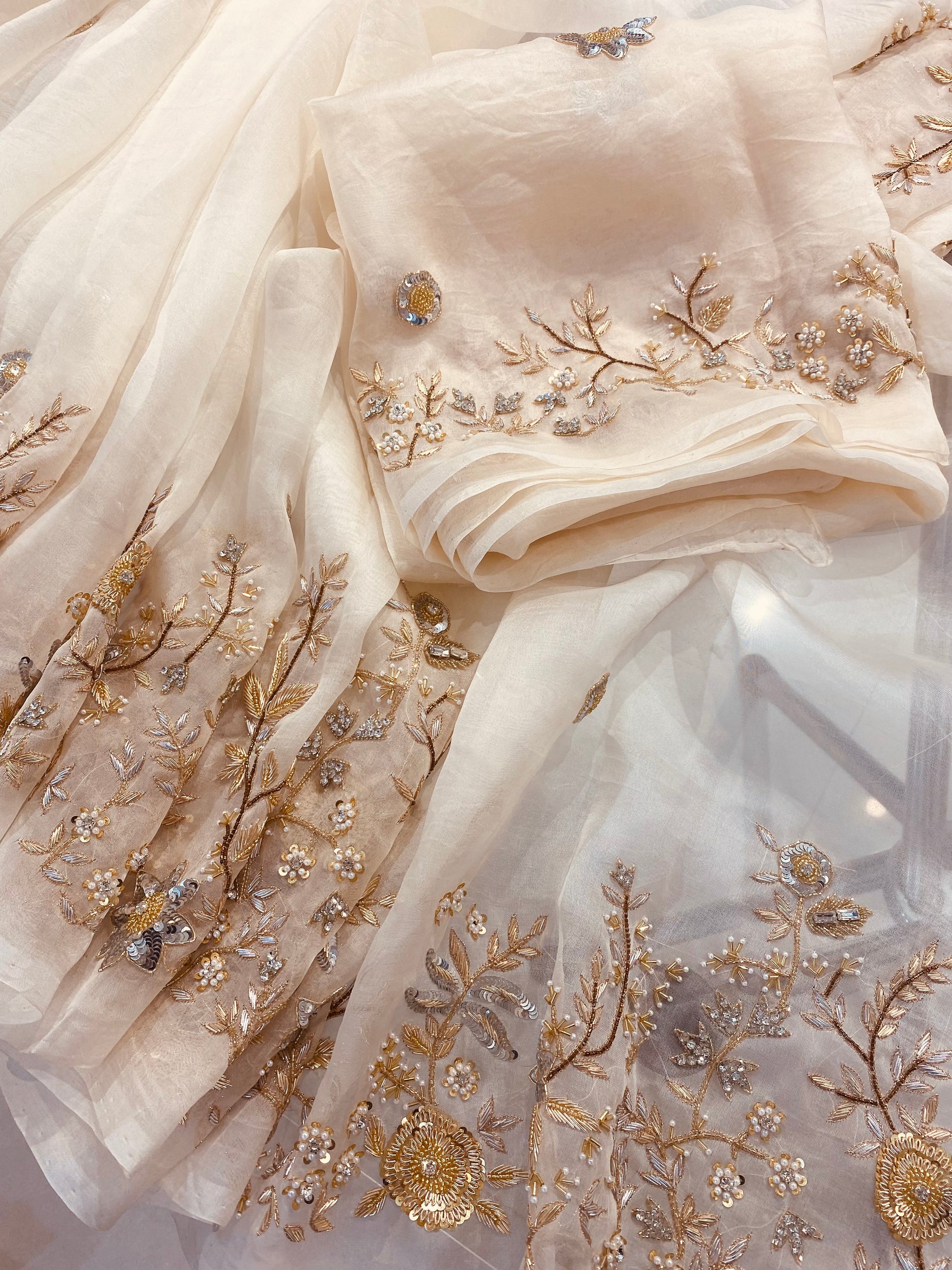 Introducing a masterpiece from our Trousseau Collection—an ivory saree crafted in pure silk organza, celebrated for its unmatched sheen, softness, and premium quality. This exquisite saree carries 400+ hours of intricate hand embroidery, created by highly experienced artisans. Every motif is delicately carved to reflect true heritage luxury. Perfect for weddings, trousseau curation, and special occasions.