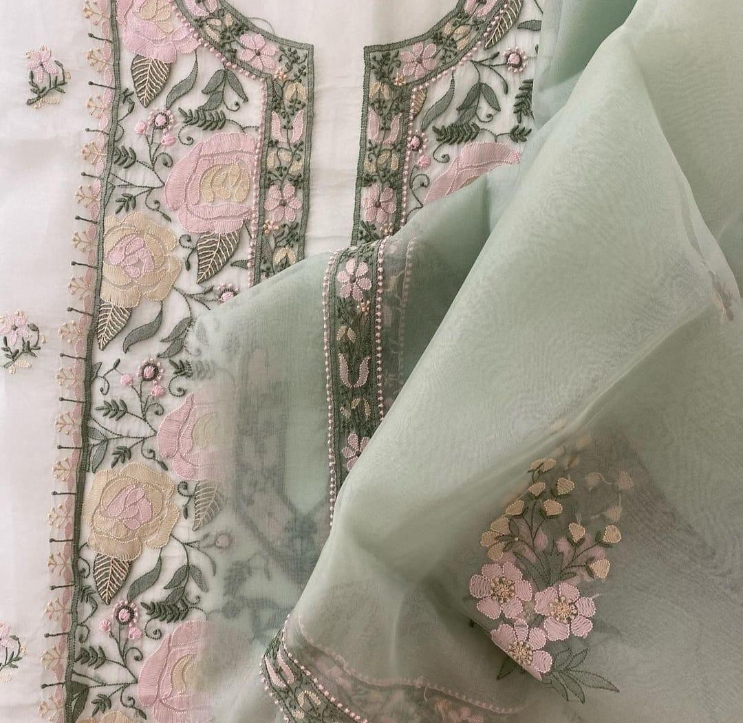 Discover Nazakat — a signature creation by Atharva Heritage. Crafted in pure silk organza on a soft ivory base, this ensemble is adorned with contrasting Pista green hand Lucknowi chikankari embroidery. Paired with a graceful dupatta (2.5 meters) and 3.25 meters of kurta fabric, this unstitched masterpiece celebrates timeless craftsmanship and versatile luxury — designed to be tailored to your perfect fit.