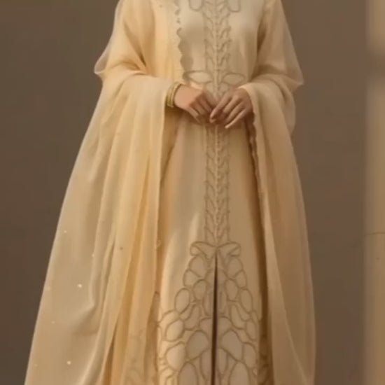 The A-line kurta, tailored in pure raw silk (80 grams), features all-over monochrome hand embroidery extending across the front, back, and sleeves, offering depth and sophistication while maintaining a subtle, luxurious aesthetic. The soft beige hue enhances the intricacy of the craftsmanship, making it an effortless statement of grace.