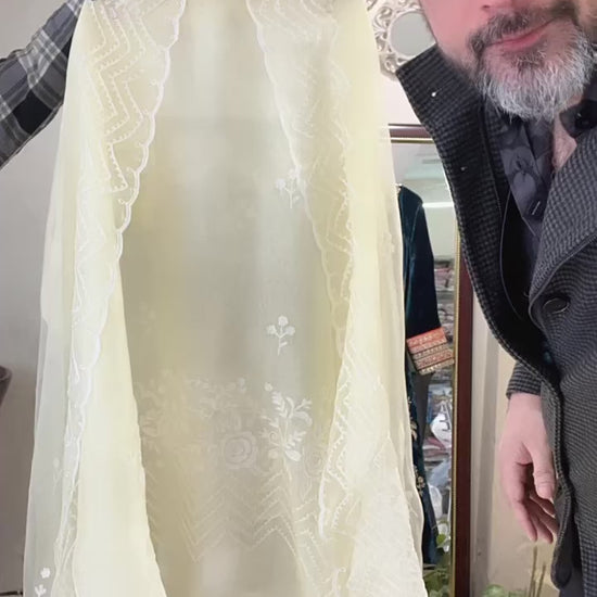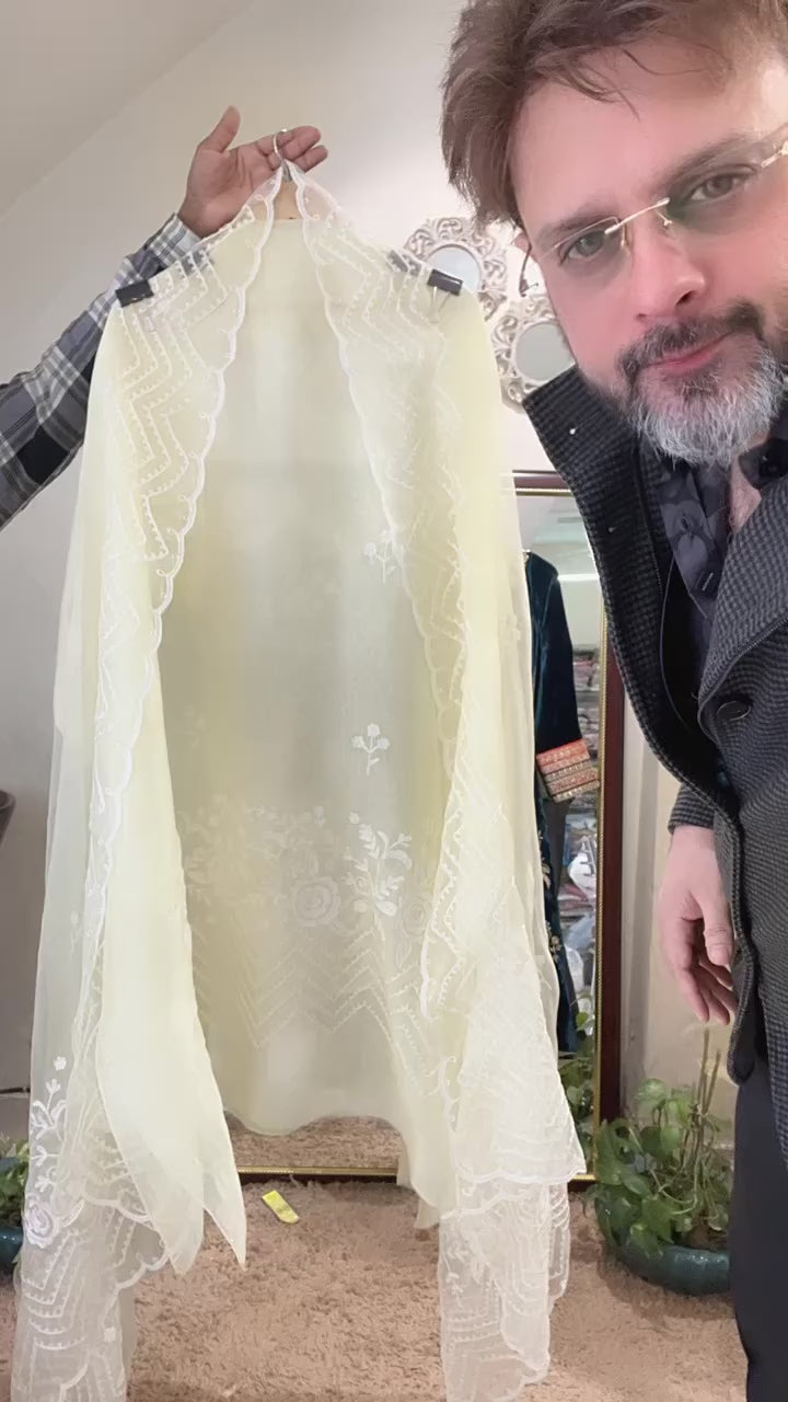 The kurta is made from pure silk organza, beautifully adorned with delicate French thread embroidery on the front, back, and sleeves, showcasing exceptional craftsmanship. It is paired with a pure silk organza dupatta, enhanced with a four-side embroidered border that adds richness and sophistication. Completing the ensemble is a pure modal satin bottom, offering a smooth and graceful drape.