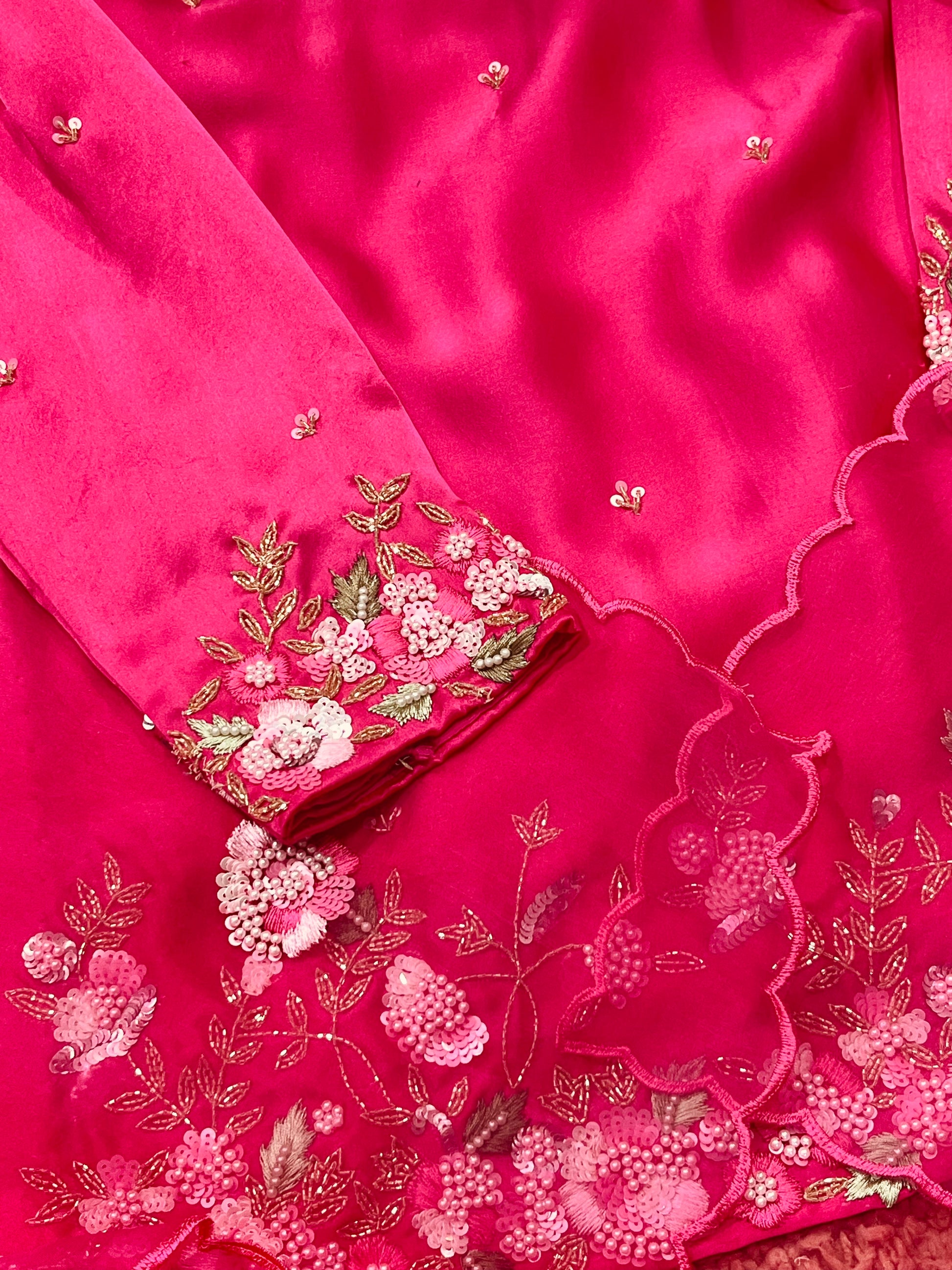 - Dupatta: Pure silk organza, delicately scalloped on all four sides and beautifully hand-embroidered with booties throughout.