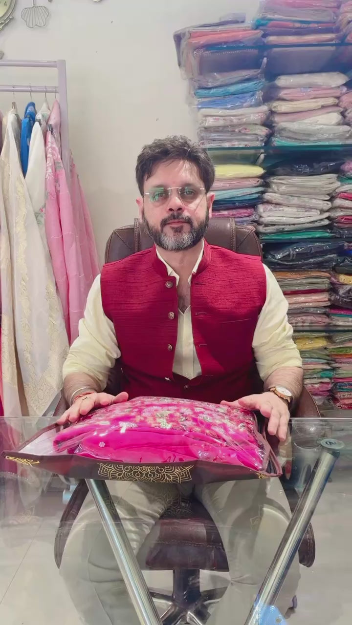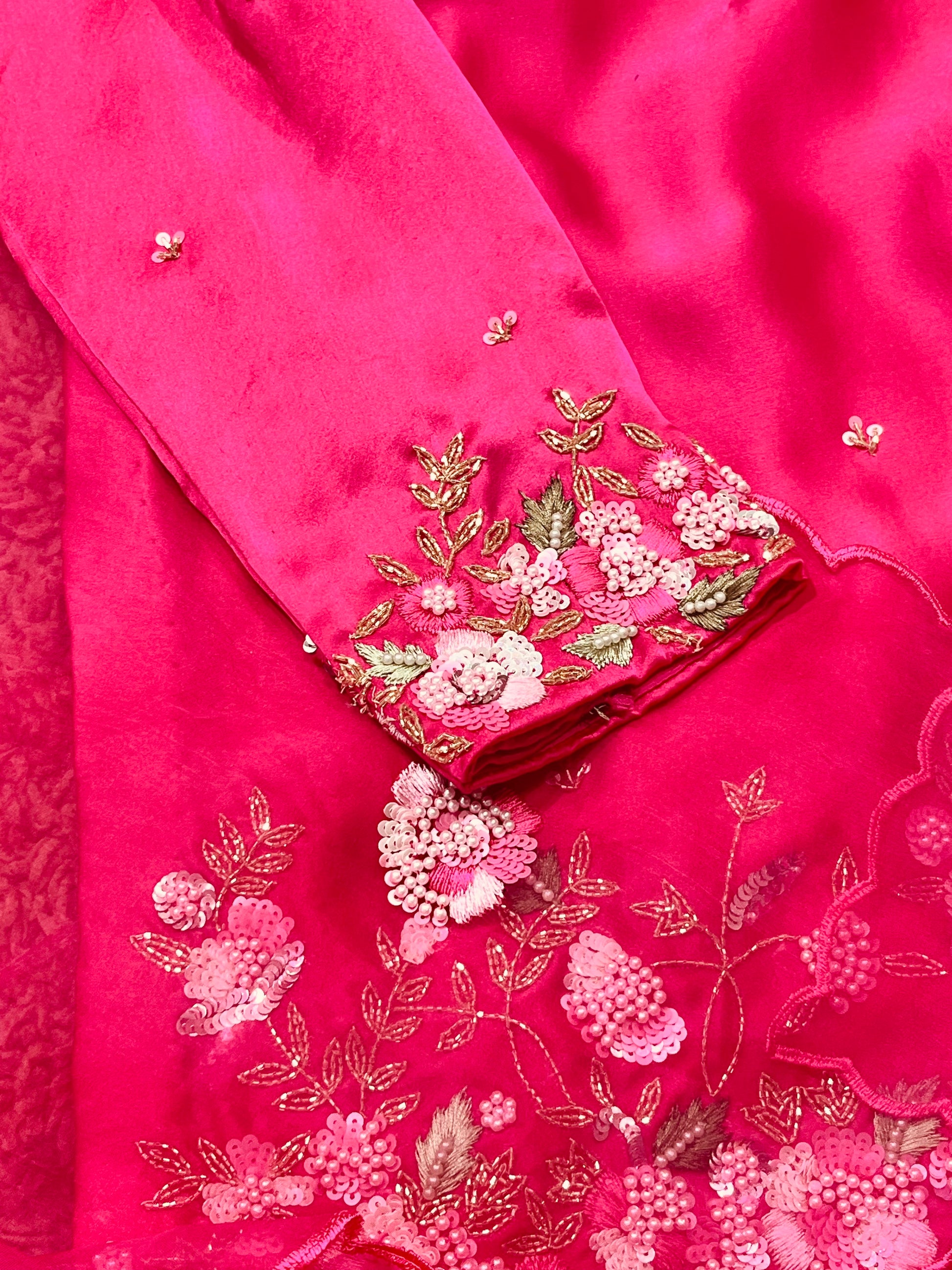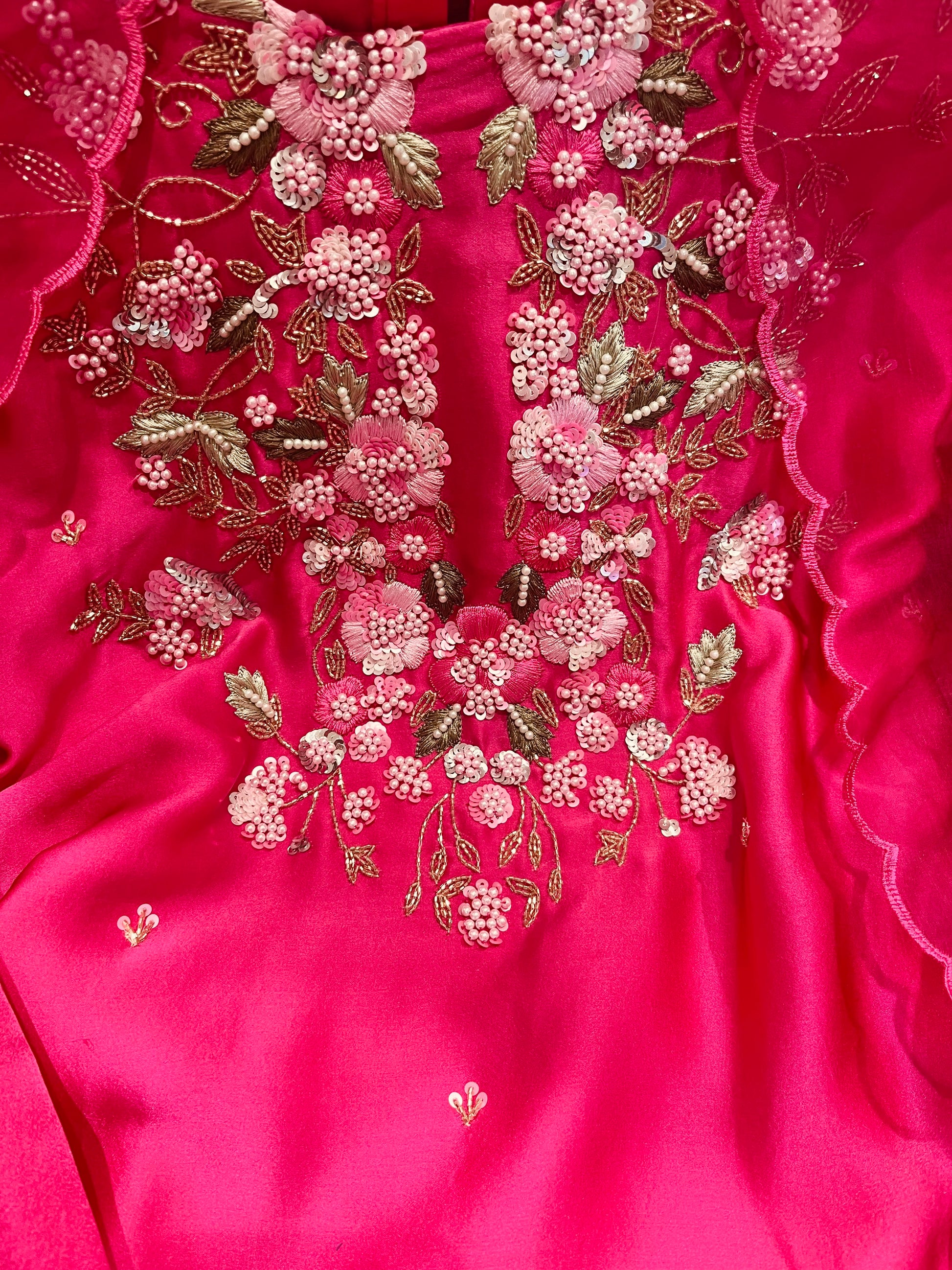 - Kurta: Pure satin silk with intricate hand embroidery on the yoke, ghera, and sleeves, with detailed embroidery all over the kurta.
