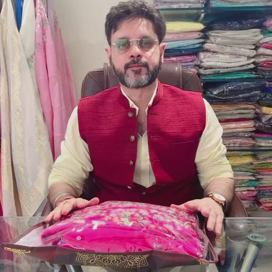 This premium designer suit is available in unstitched, fully stitched, and custom-stitched options to your exact measurements.