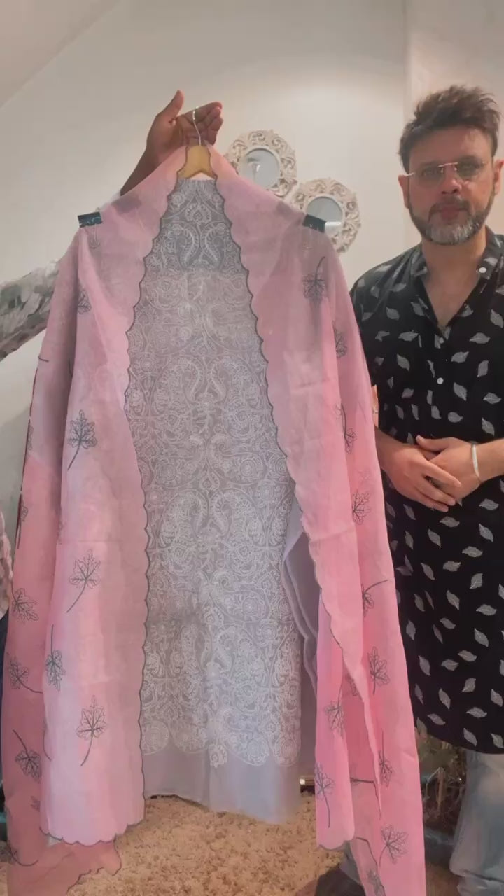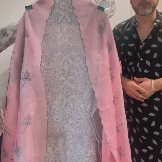 Luxury Grey & Powder Pink Pure Chanderi Silk Pakistani Suit – Hand Embroidered, Unstitched