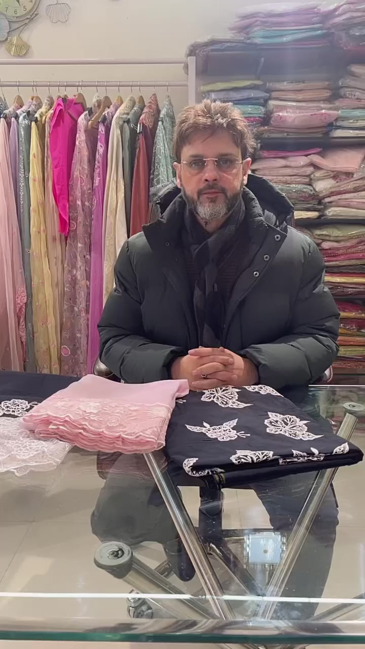 This unstitched suit can be tailored to any size, making it perfect for a custom fit. The classic black and white combination ensures an evergreen charm, while the meticulous handwork makes it a must-have for your festive and occasion wear wardrobe.