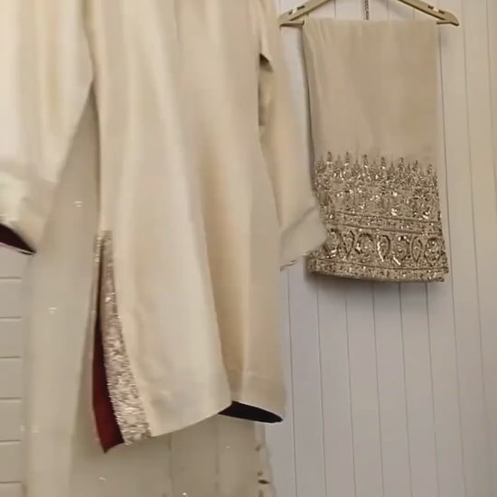 Introducing a stunning ensemble crafted from exquisite stitched pure Satin silk fabric. The shirt is adorned with intricate Hand embroidered work with Intricate Zardozi,Kohra , Dabka , Stones ,Pearl Work , showcasing meticulous embroidery. The dupatta is a true masterpiece, featuring vibrant interacted hand embroidered detailing . The dress includes an elegant inner for added comfort and a pair of Pure Silk trousers a beautiful hand embroidery with Beautiful Hand Zardozi Embroidery a true Masterpiece , made from high-quality grip fabric. This ensemble is a harmonious blend of artistry and style✨🌼