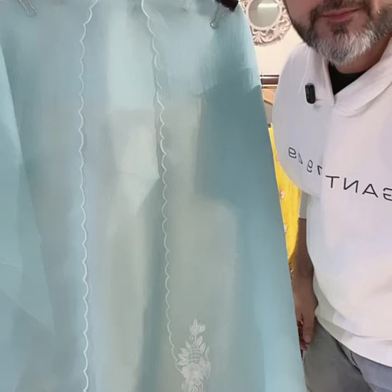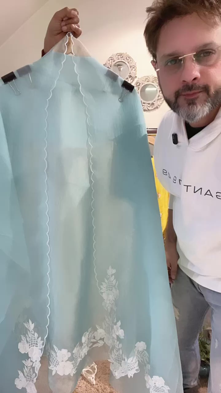 Elevate your festive wardrobe with this exquisite Pure Organza Silk Pakistani Suit, a timeless creation that embodies elegance and craftsmanship. Adorned with intricate pearl Parsi embroidery, the shirt showcases delicate detailing that reflects refined artistry and luxurious appeal.