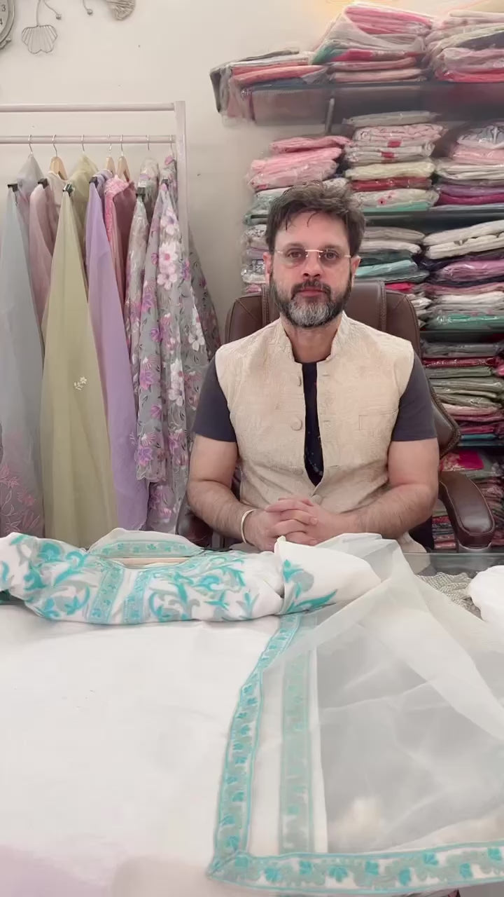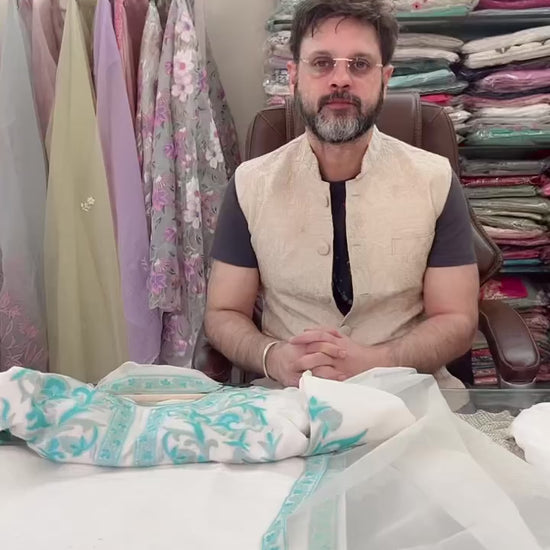 Paired with a Pure Silk Organza dupatta (2.5 metres) featuring a stunning Kashmiri embroidered border, this ensemble radiates grace and sophistication. The look is completed with Pure Crepe Silk dhoti bottoms (36-inch length, customisable) for a contemporary twist on a classic silhouette.