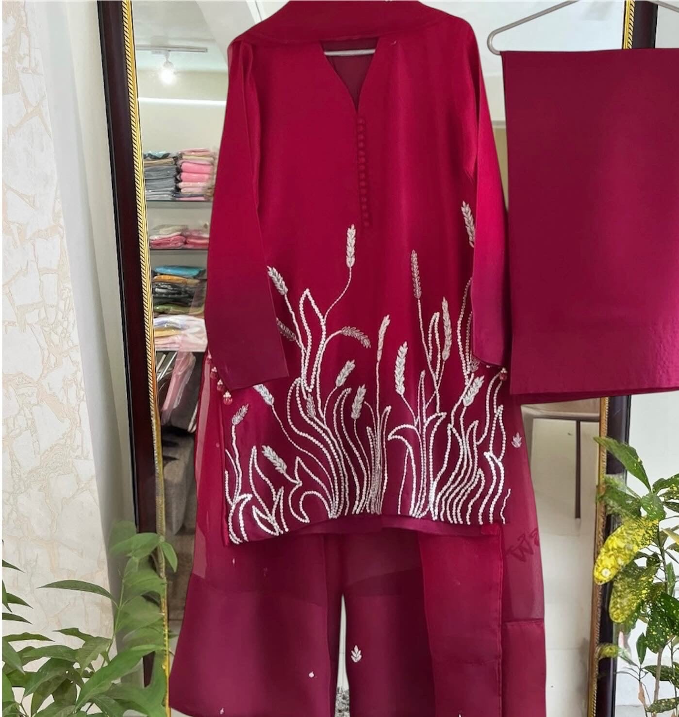 The kurta features exquisite hand-embroidered embellishments on the ghera, finished with delicate floral motifs that elevate its grace. Paired with a Pure Satin Silk Farshi Salwar (40”), this ensemble flows with timeless grandeur. Completing the set is a Pure Silk Organza Dupatta (2.5m), adorned with dainty bootis and intricate backspacing for a touch of understated sophistication. 🌸
