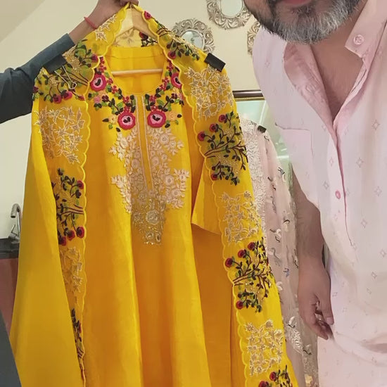 The Design is done very intricately by our most experienced craftsman, complete Hand embroidered by using Different techniques of embroidery like knot work, Zardozi , dabka , kohra . The entire suit is made of Hand embroidery