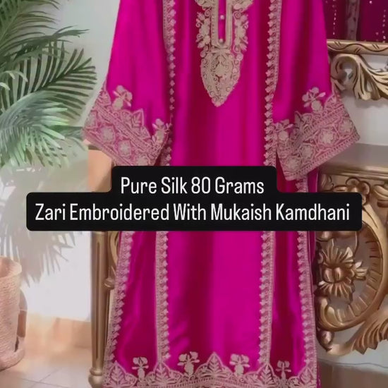 Step into timeless elegance with this exquisite pure satin silk Pakistani suit, crafted from premium 80-gram satin silk that drapes beautifully with a natural sheen. The kurta is a masterpiece of craftsmanship, featuring intricate zari embroidery all over the front, accentuated with rich zari borders on the yoke, ghera, and sleeves — a perfect harmony of tradition and modern sophistication.