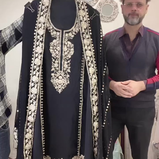 Step into timeless elegance with this exquisite pure satin silk Pakistani suit, crafted from premium 80-gram satin silk that drapes beautifully with a natural sheen. The kurta is a masterpiece of craftsmanship, featuring intricate zari Puta Tilla embroidery all over the front, accentuated with rich zari borders on the yoke, ghera, and sleeves — a perfect harmony of tradition and modern sophistication.