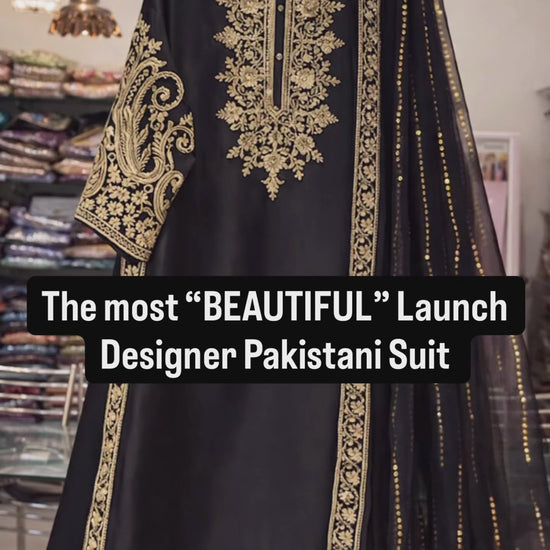 Step into timeless elegance with this exquisite pure satin silk Pakistani suit, crafted from premium 80-gram satin silk that drapes beautifully with a natural sheen. The kurta is a masterpiece of craftsmanship, featuring intricate zari embroidery all over the front, accentuated with rich zari borders on the yoke, ghera, and sleeves — a perfect harmony of tradition and modern sophistication.