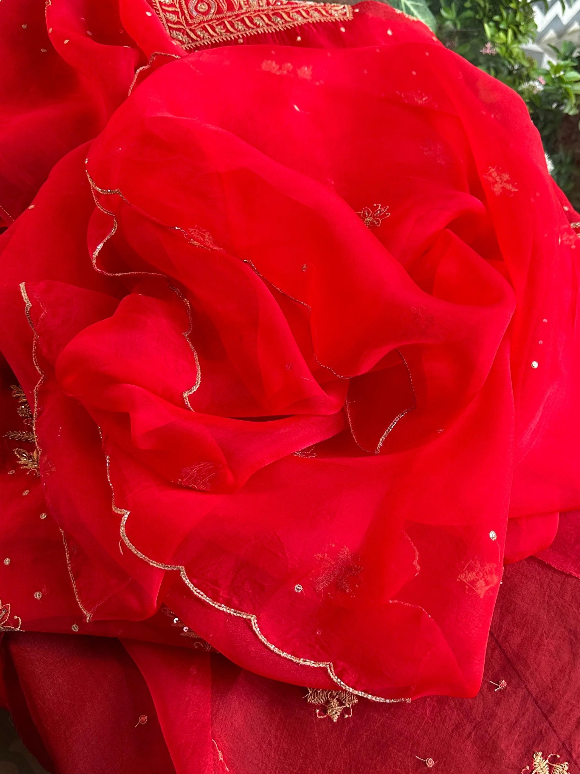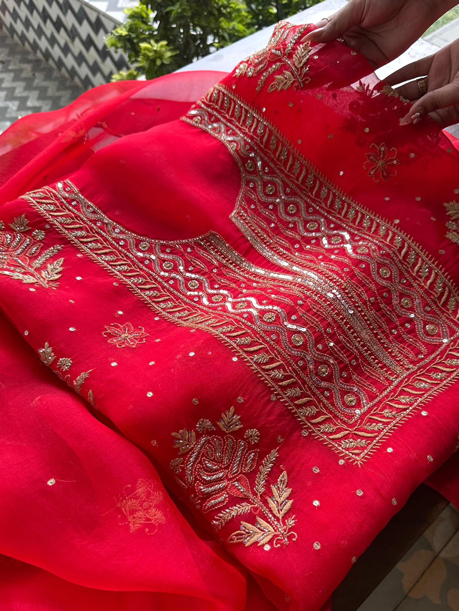 Atharva Heritage Red Noor Organza Silk Chikankari Unstitched Kurta Dupatta Set SL89000646