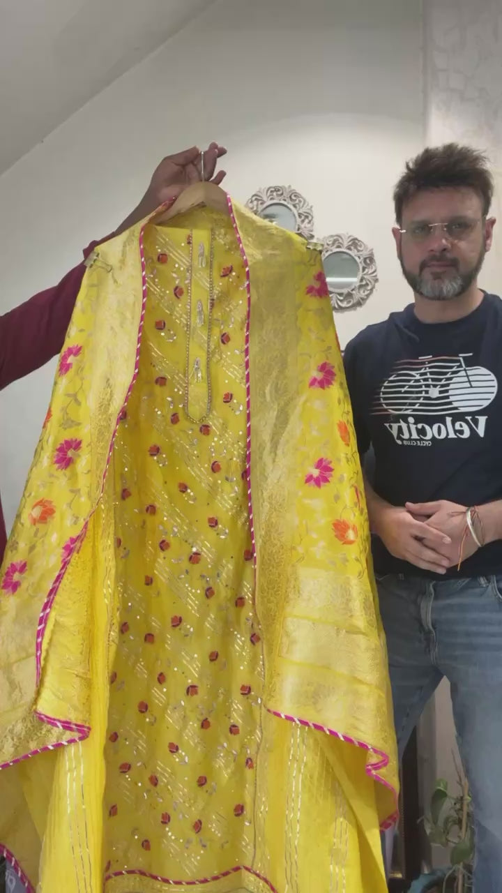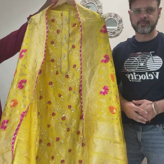 Bask in the glow of pure elegance with our most viral and most celebrated design, now in a breathtaking festive yellow. This unstitched luxury set features a 3.5m Pure Chanderi Silk Kurta (70g), adorned with intricate hand aari-dozi embroidery and fine Kota detailing. The look is elevated with a 2.5m Pure Meenakari Banarasi Dupatta, a true work of art that pairs flawlessly with the kurta. Completing the ensemble is a 2.5m Pure Clay Bottom for a perfect drape.