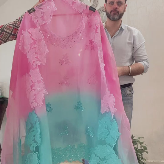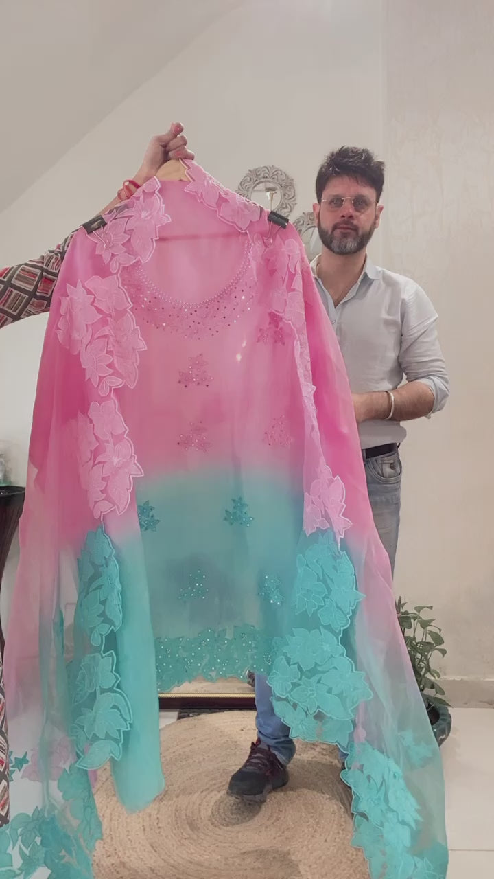 Introducing a stunning ensemble crafted from exquisite stitched pure silk organza fabric. The shirt is adorned with intricate Appliqués work, showcasing meticulous embroidery. The dupatta is a true masterpiece, featuring vibrant Applique work with embroidery. The dress includes an elegant inner for added comfort and a pair of trousers in a matching shade with cutwork , made from high-quality grip fabric. This ensemble is a harmonious blend of artistry and style✨🌼