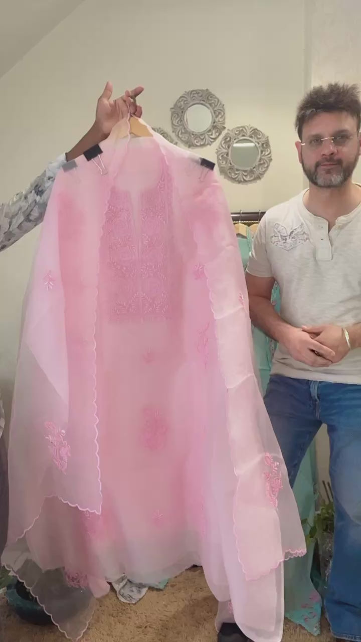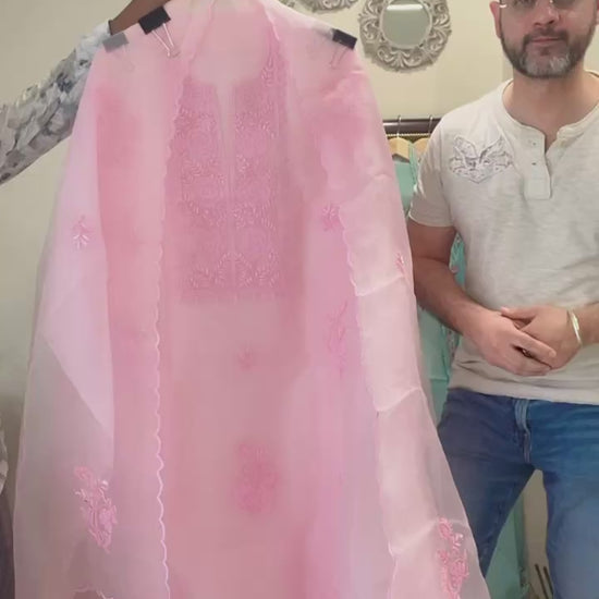 This premium Lucknowi collection is the epitome of sheer luxury. Embellished with love, the stunning pure organza silk kurta and dupatta feature intricate craftsmanship of Lucknowi chikankari handwork and delicate handwork. Complete the look with the included cotton silk lowers. Make heads turn with this elegant and fashionable ensemble.