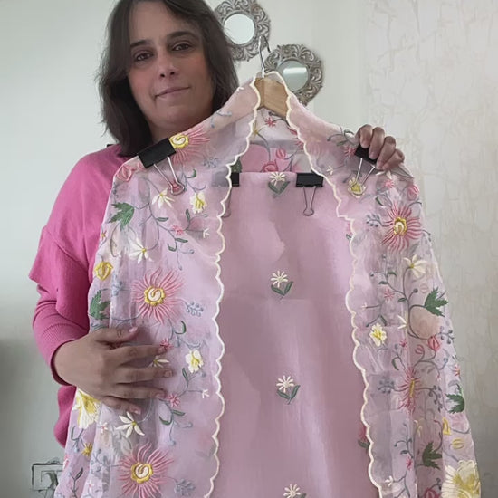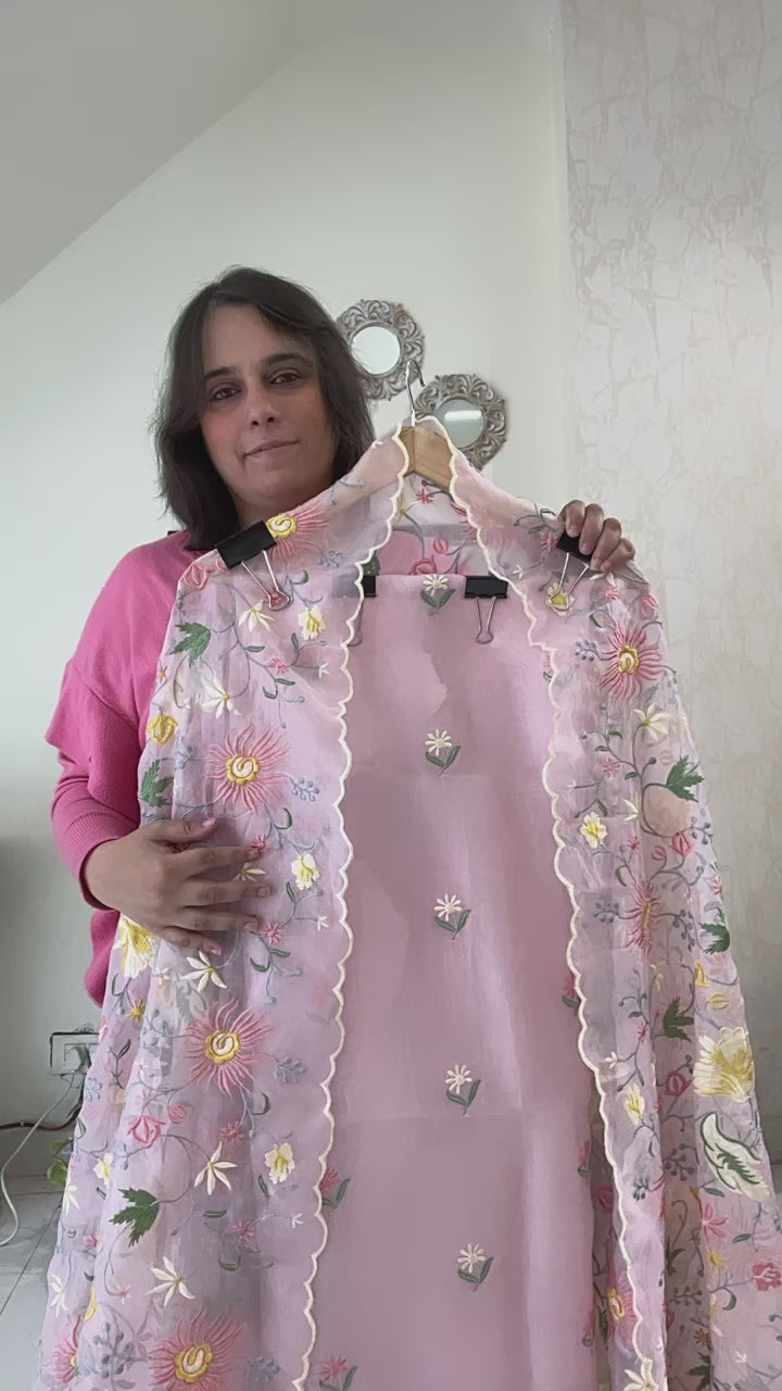 Atharva Heritage Sheer Luxury Pure Silk Organza Parsi Embroidered Powder Pink Trousseau Collection unstitched Suit AH186798