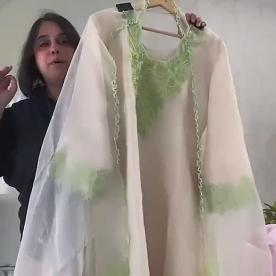 Introducing a stunning ensemble crafted from exquisite stitched pure silk organza fabric. The shirt is adorned with intricate Appliqués work, showcasing meticulous embroidery. The dupatta is a true masterpiece, featuring vibrant Applique work with embroidery. The dress includes an elegant inner for added comfort and a pair of trousers in a matching shade with cutwork , made from high-quality grip fabric. This ensemble is a harmonious blend of artistry and style✨🌼