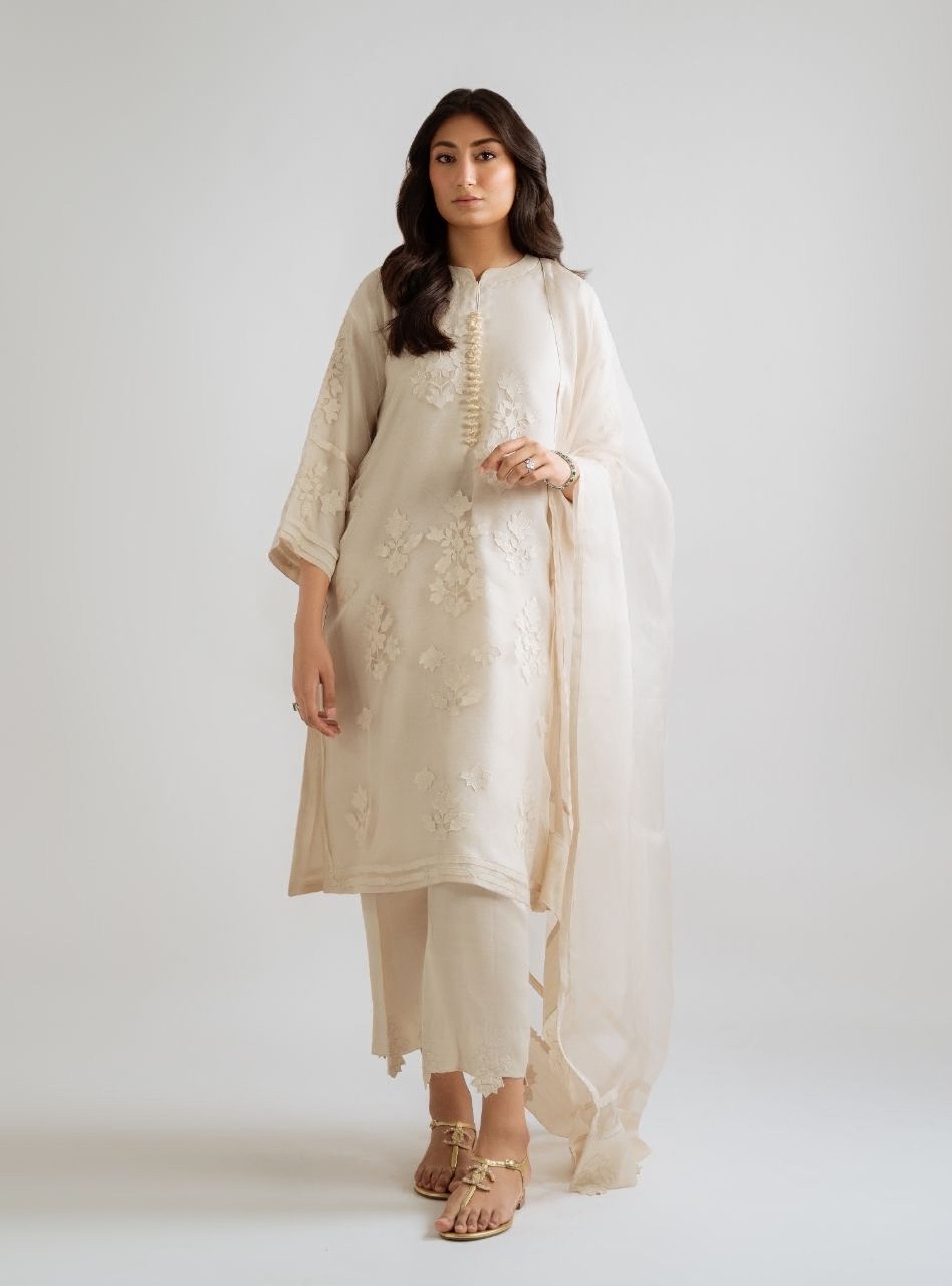 Experience understated luxury with this hand-crafted three-piece ensemble. The kurta and dupatta are made from pure silk organza, paired with pure crepe pants for a graceful fall and comfort. Adorned with delicate hand-appliqué floral motifs, this piece celebrates heritage craftsmanship and modern minimalism.