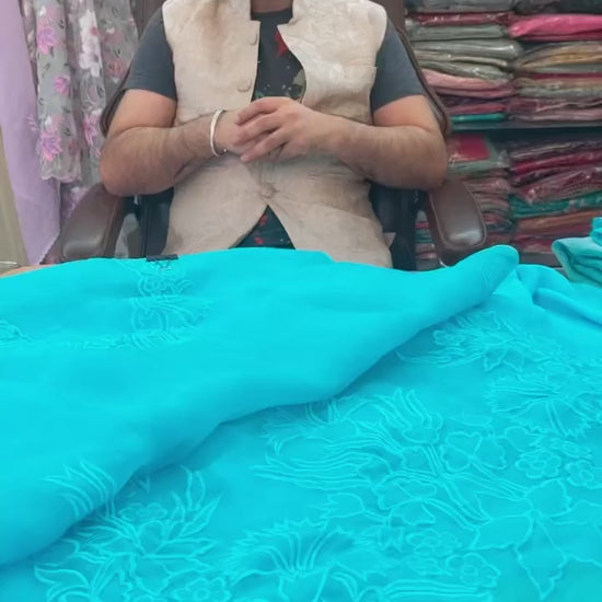 Introducing a stunning ensemble crafted from exquisite stitched pure silk organza fabric. The shirt is adorned with intricate Applique work, showcasing meticulous embroidery with sleeveless crepe inner with stunning embroidery on ghera and slits . The dupatta is a true masterpiece of Crushed Fabric . The dress includes an elegant inner for added comfort with beautiful embroidery and a pair of crushed Plazzo in a matching shade, made from high-quality grip fabric. This ensemble is a harmonious blend of artistry and style