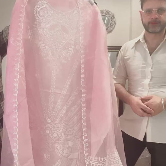 Introducing a stunning ensemble crafted from exquisite stitched pure silk organza fabric. The shirt is adorned with intricate Embroidery work, showcasing meticulous embroidery with sleeveless crepe inner . The dupatta is a true masterpiece of Pure Silk Organza With 4 side border . The dress includes an elegant inner for added comfort w and a pair of Crepe embroidered pants in a matching shade, made from high-quality grip fabric. This ensemble is a harmonious blend of artistry and style