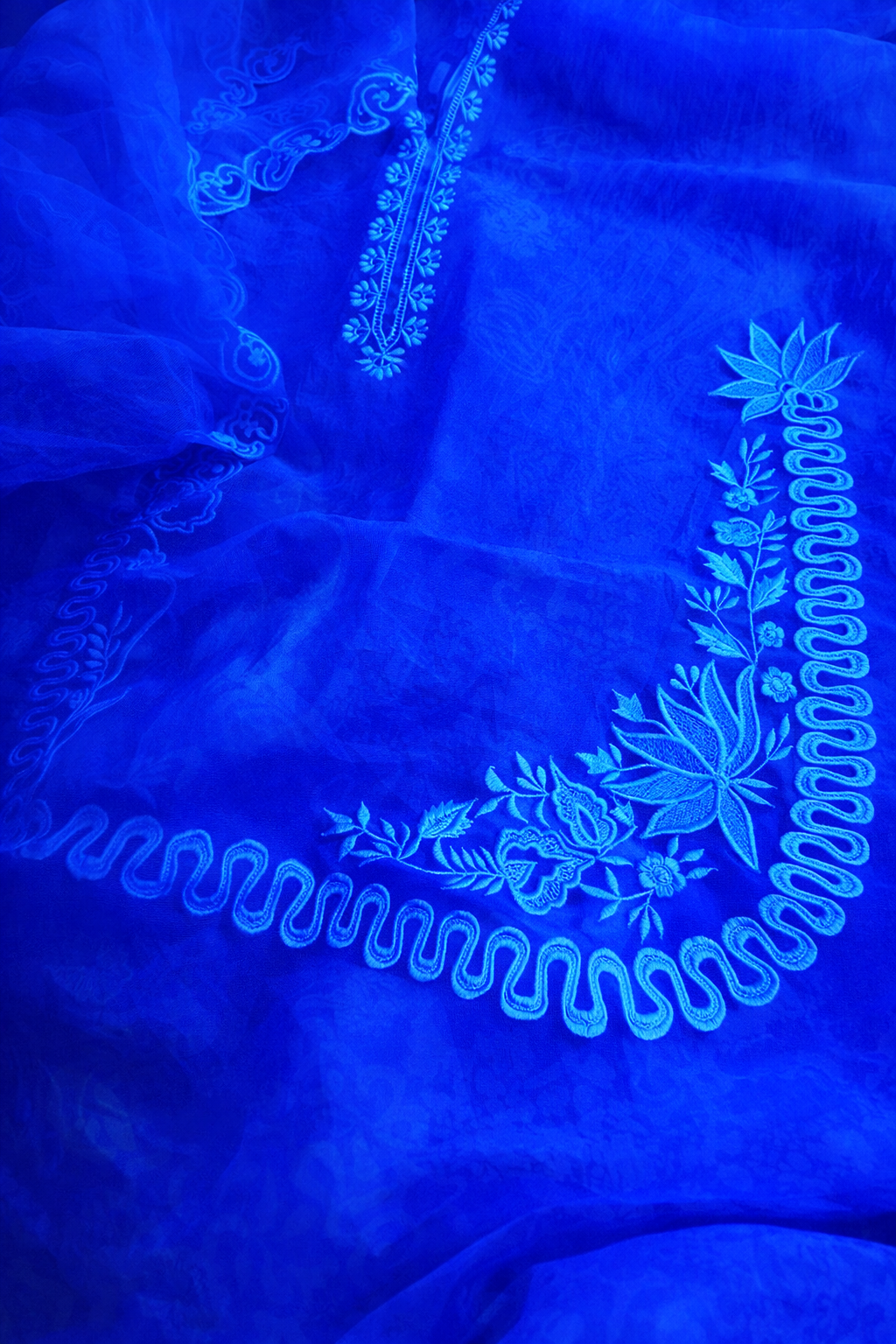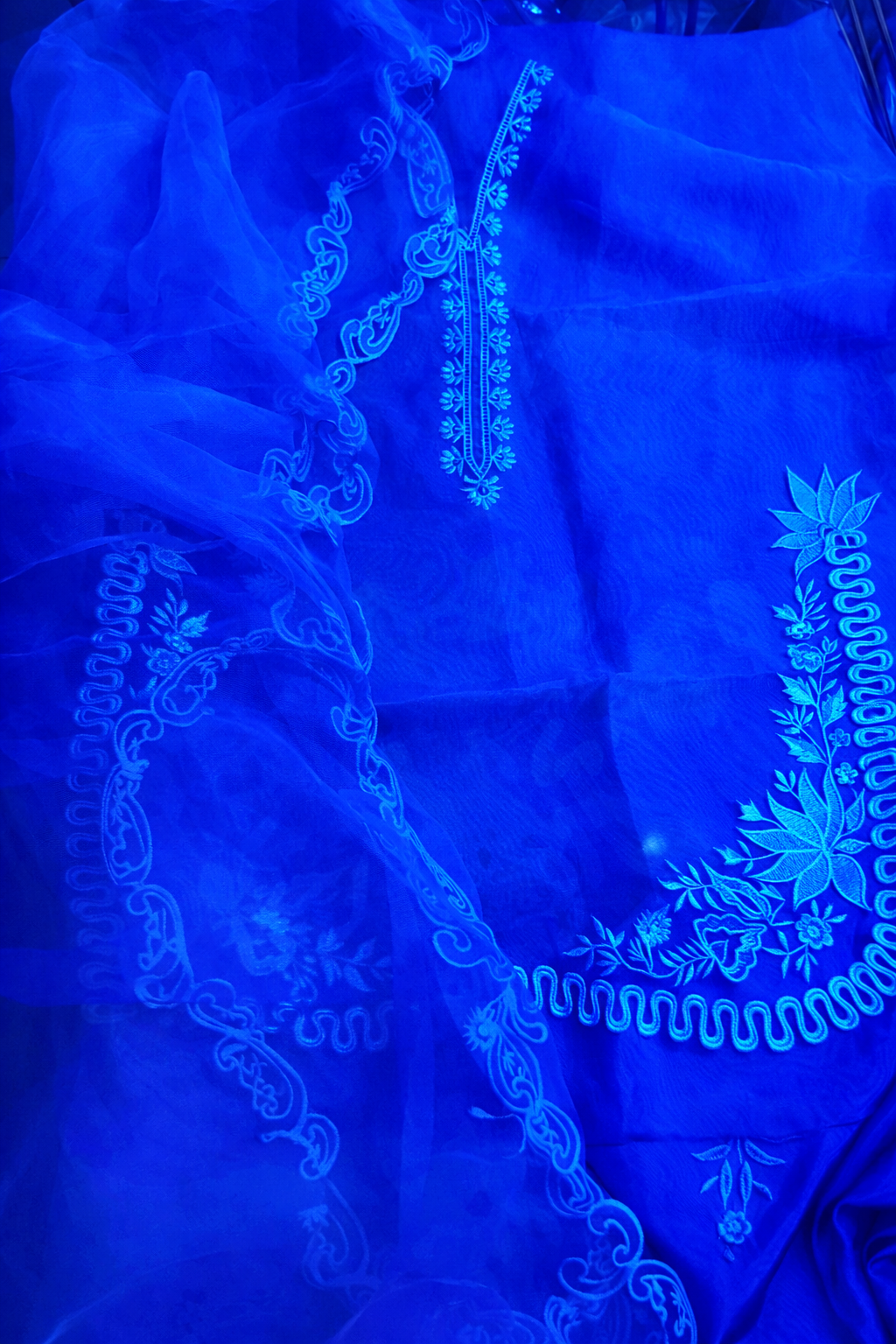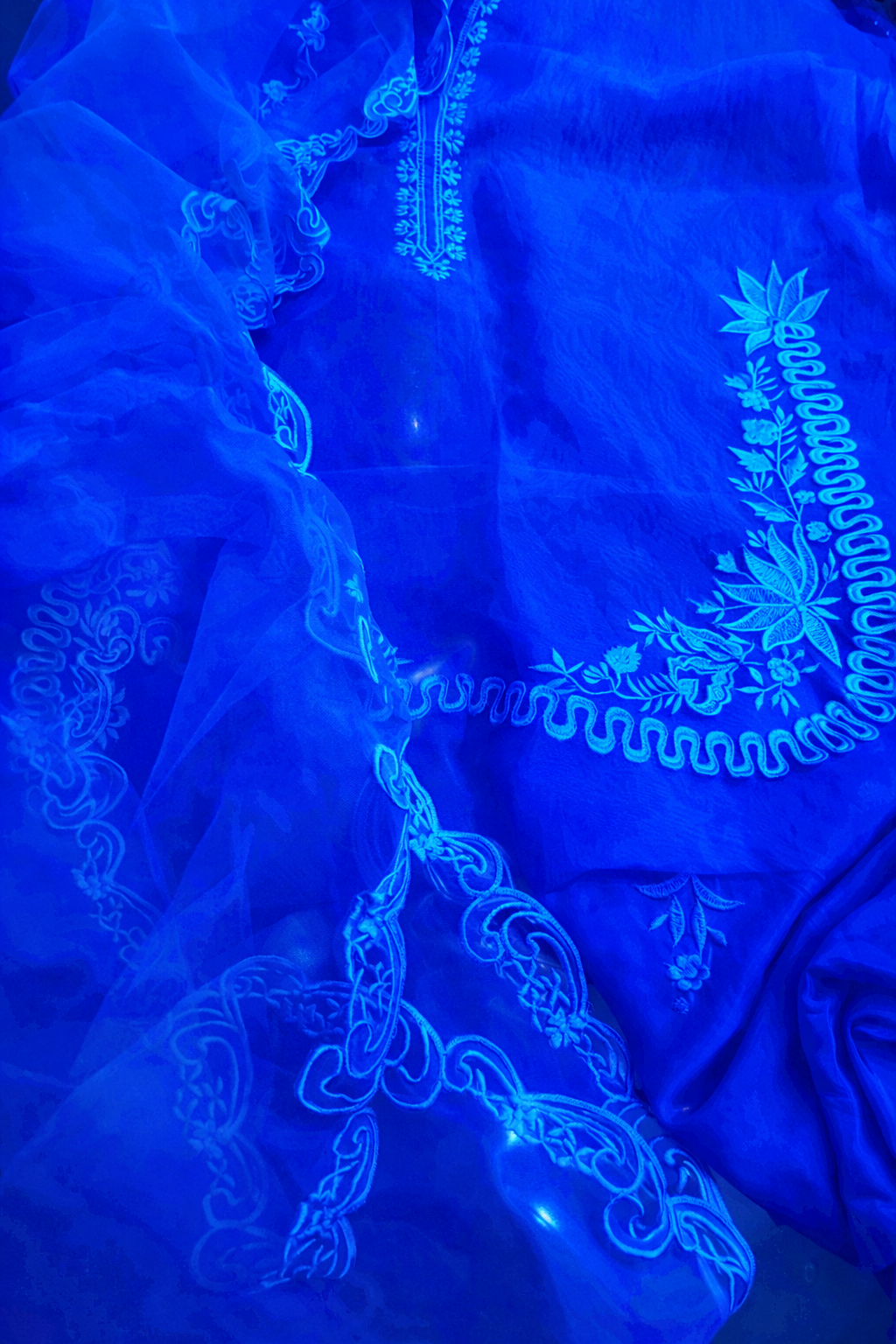 Crafted from 100% pure silk organza, the kurta features outstanding hand-appliqué cut-work throughout, with detailed artistry on the front kheda, back kheda, yoke, and sleeves.