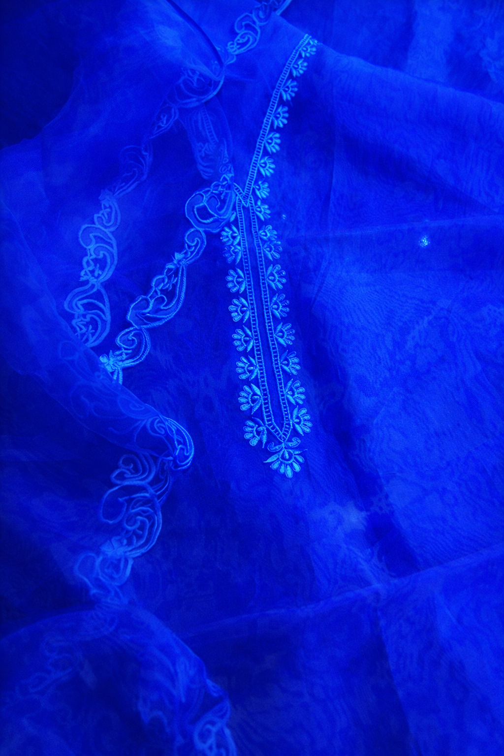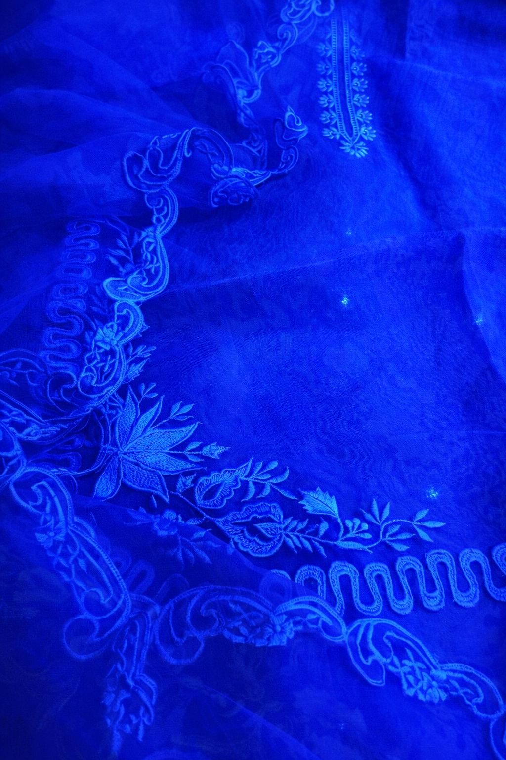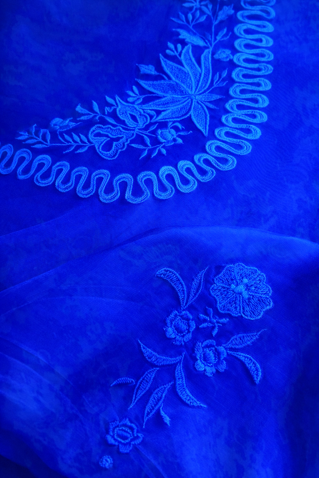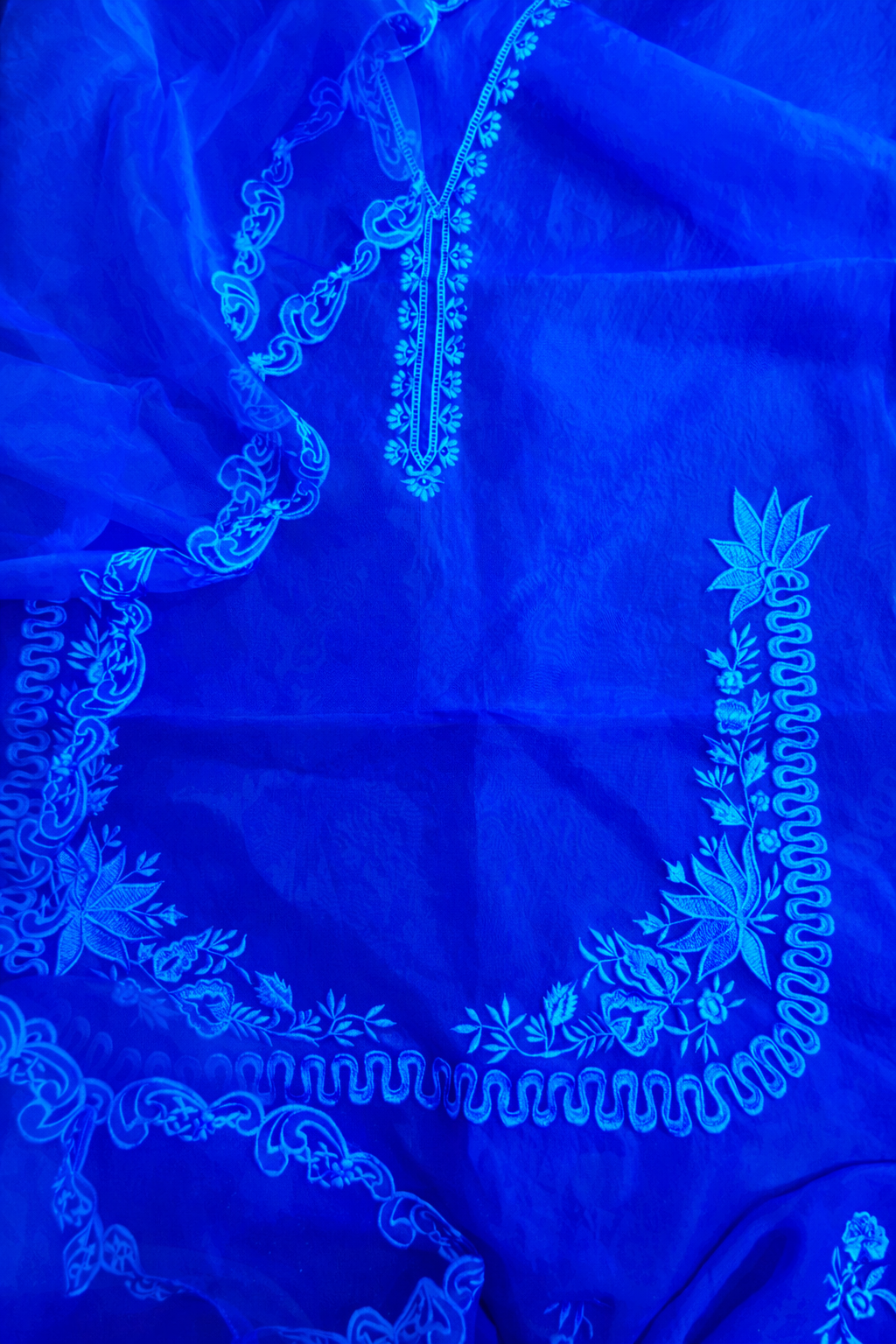 Crafted from 100% pure silk organza, the kurta features outstanding hand-appliqué cut-work throughout, with detailed artistry on the front kheda, back kheda, yoke, and sleeves.