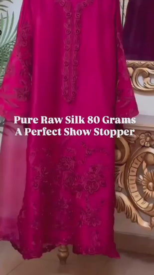 Crafted in pure raw silk (80 grams), this fully stitched Pakistani Suit is the definition of timeless luxury.